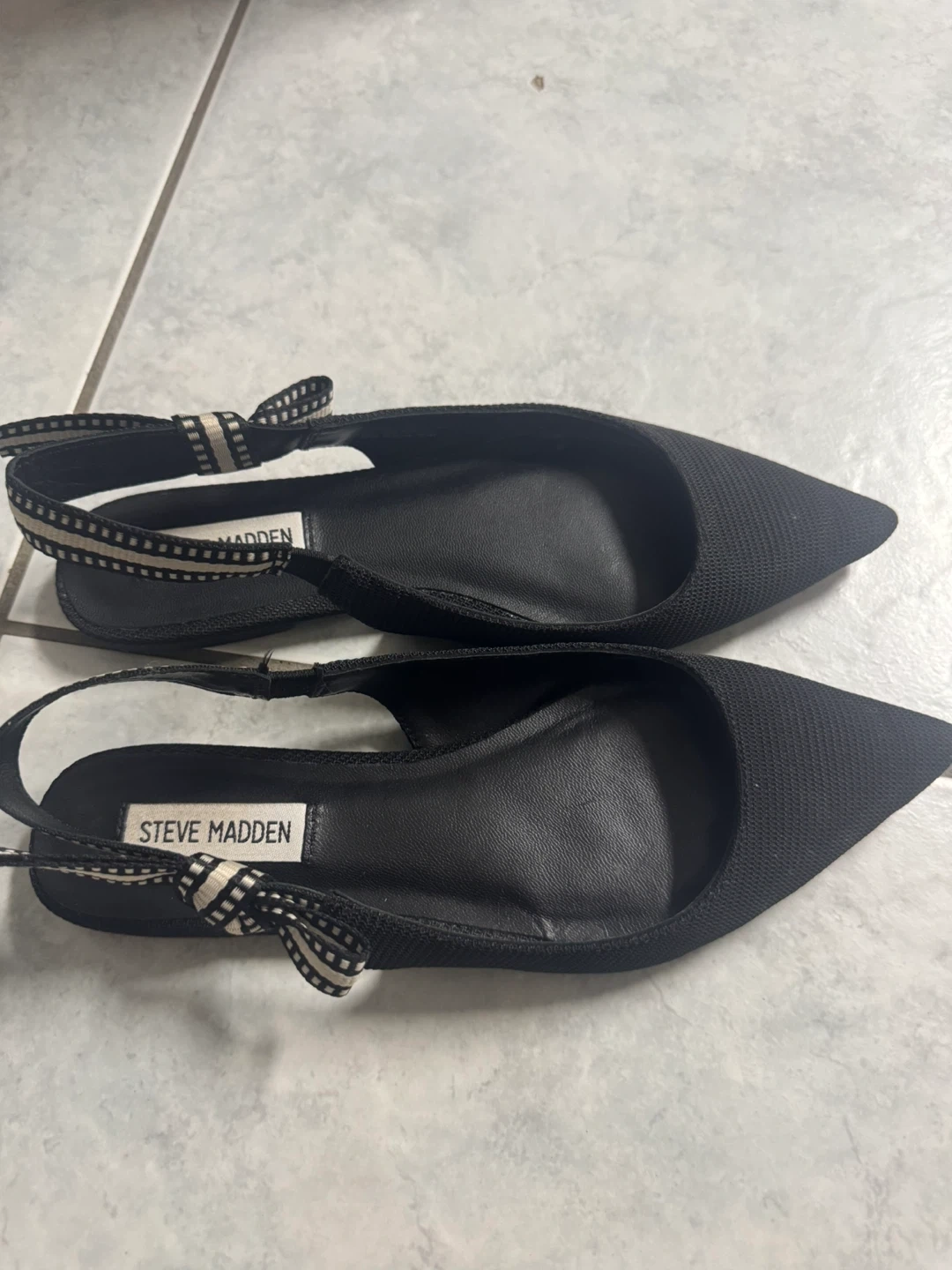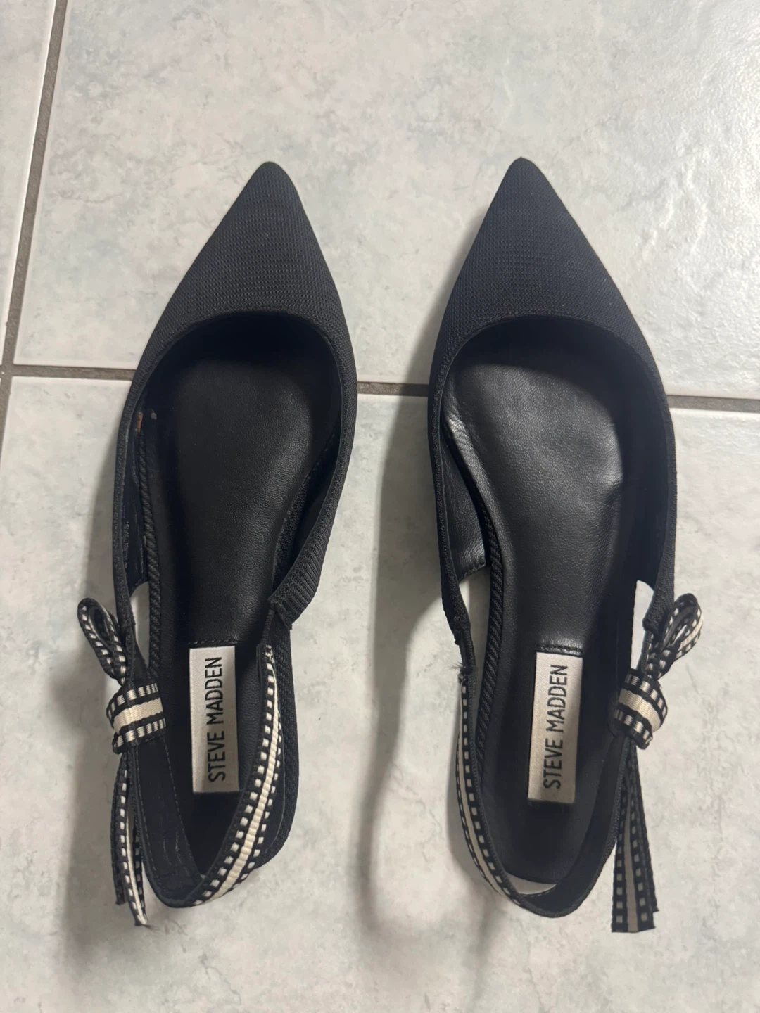 Steve Madden black pointed toe slingback flats. Knit fabric upper with elasticated slingback strap featuring a bow detail. Comfortable and stylish choice for everyday wear.