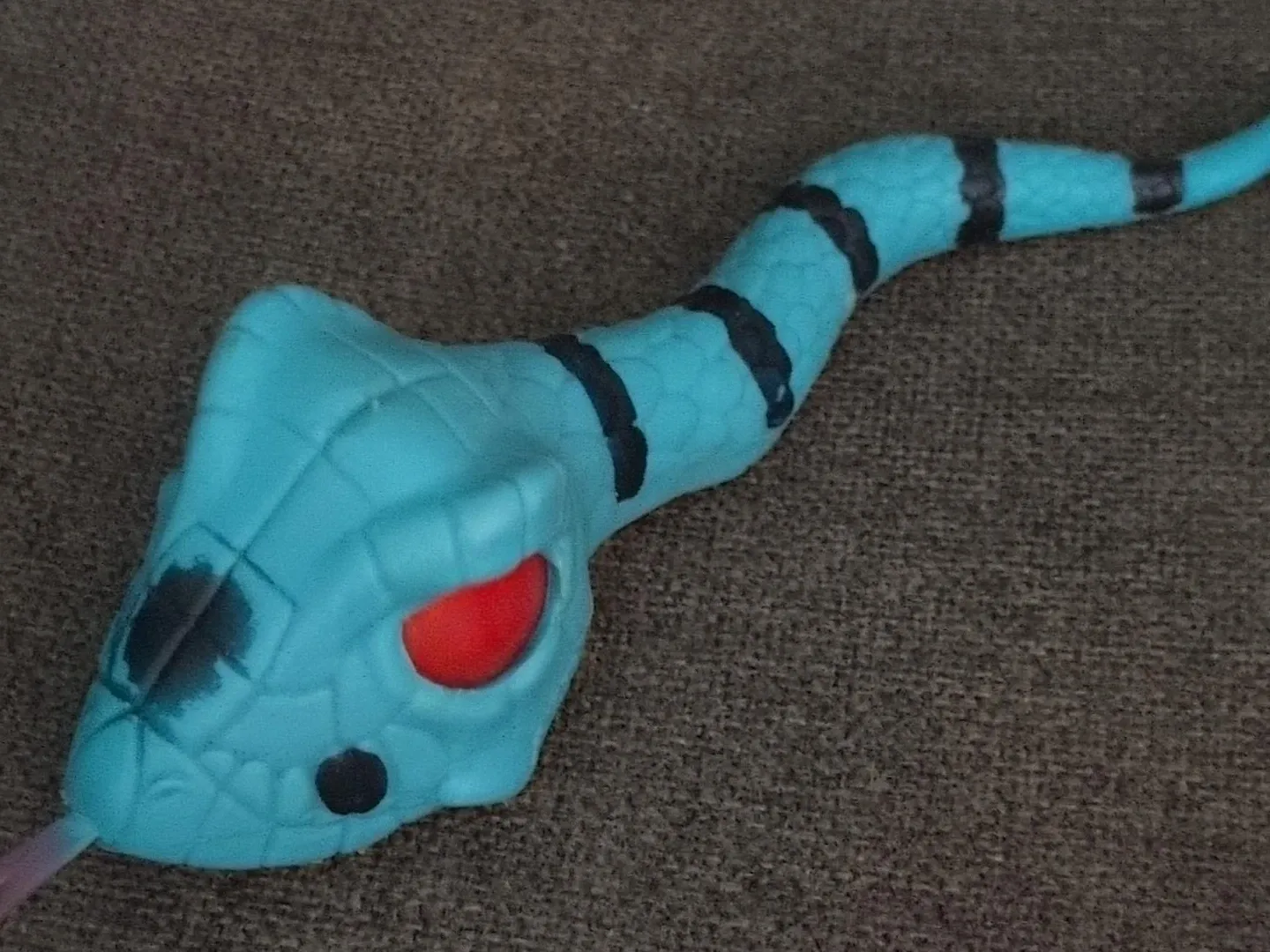 This is a light blue snake toy with black bands and red eyes. The material appears to be plastic. It has a plastic red ball filled with water, inside the snake toy's head, for the eyes. It's basically a stress toy. You squeeze the head to release stress!