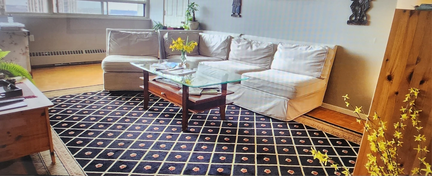 We are selling, beautiful, wool carpet. The color is black and cream,with burgundy colour roses.