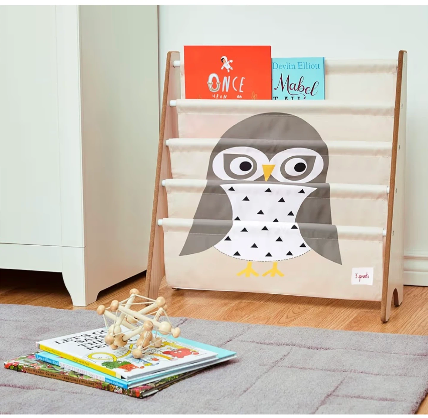 This book rack features a cute owl design! It's great for organizing kids' books and keeping them accessible. Sturdy wooden frame with fabric pockets.