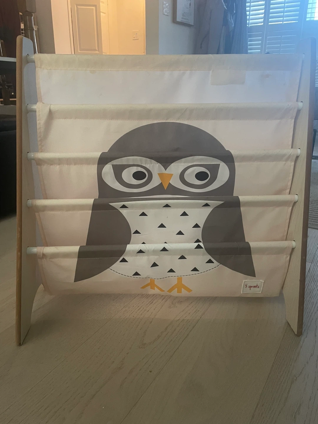 This book rack features a cute owl design! It's great for organizing kids' books and keeping them accessible. Sturdy wooden frame with fabric pockets.