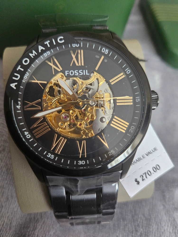 Men's automatic watch. Black stainless steel band and case. Skeleton dial. Comes in original box.