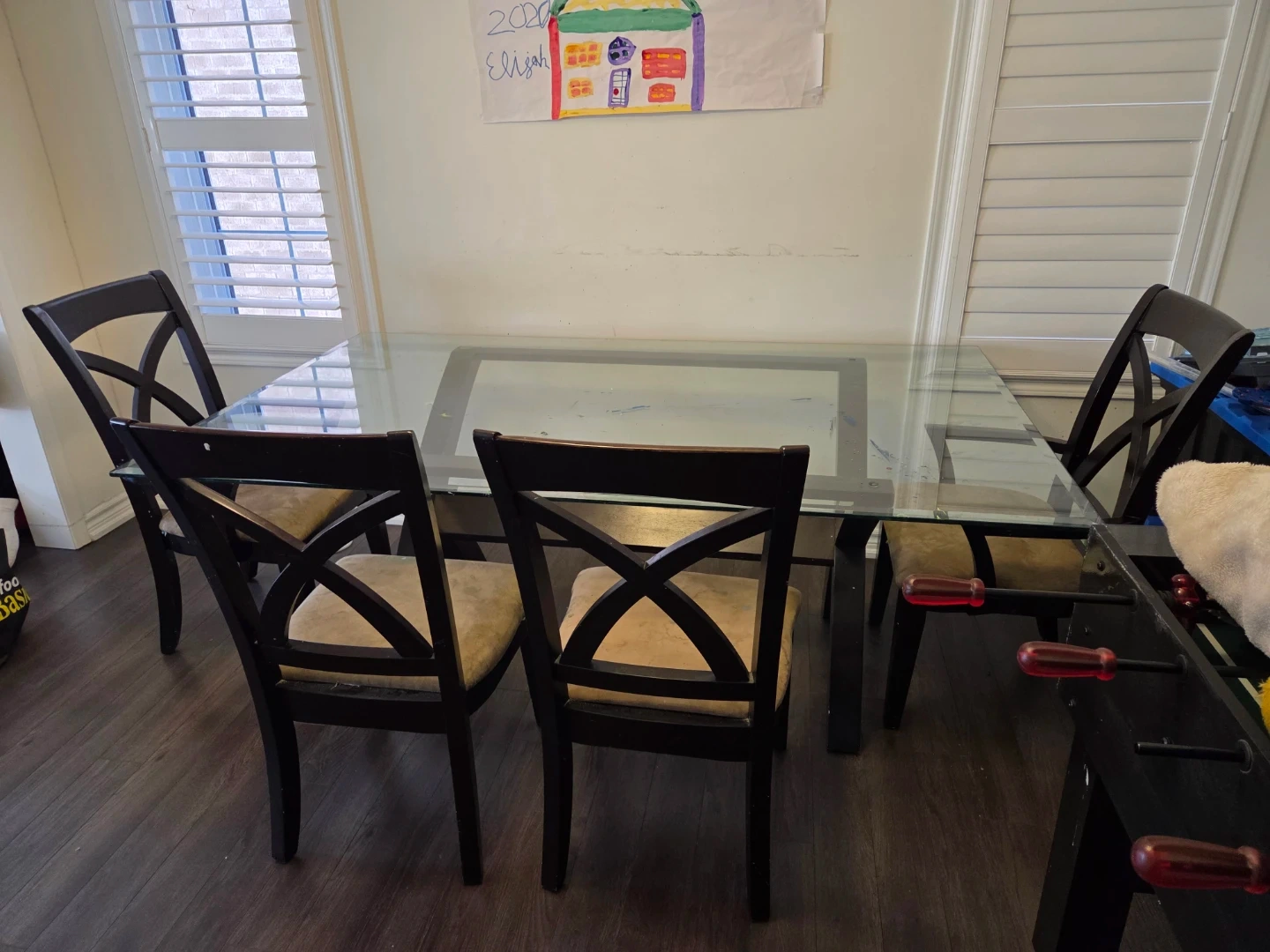 Dining set includes a glass-top table with a dark wood base and six matching chairs. Chairs have cushioned seats and dark wood frames with a criss-cross design on the back. Seats four comfortably.