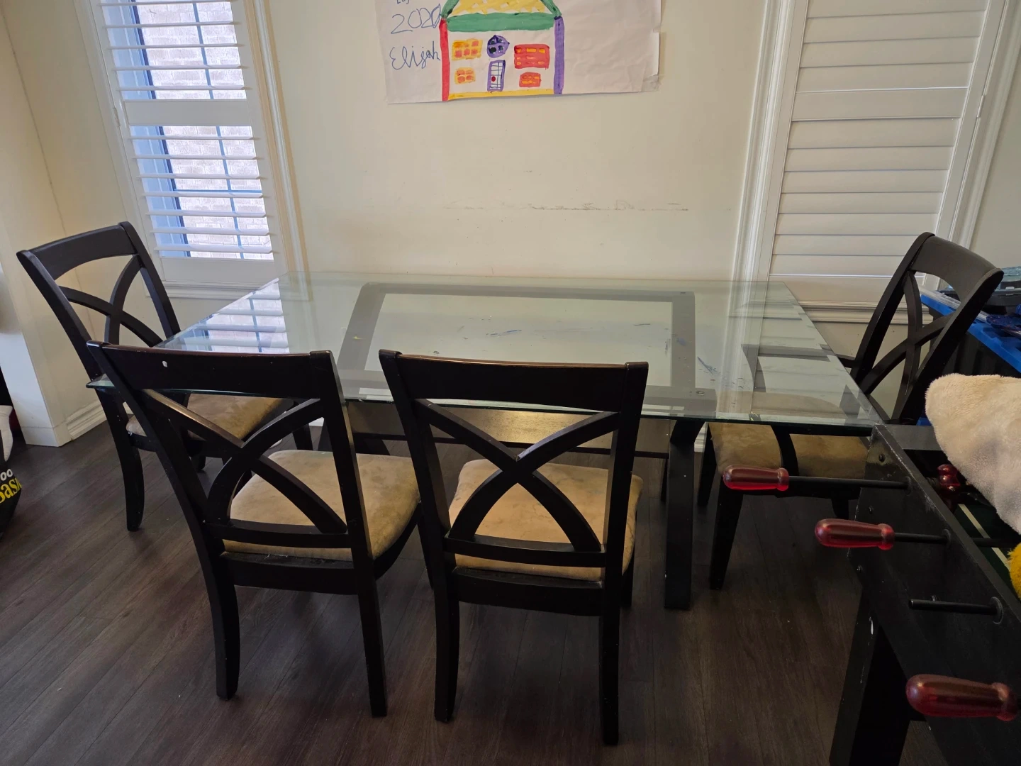 Dining set includes a glass-top table with a dark wood base and six matching chairs. Chairs have cushioned seats and dark wood frames with a criss-cross design on the back. Seats four comfortably.