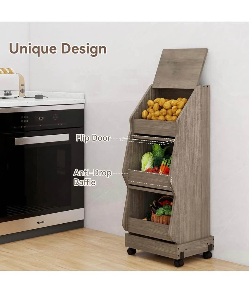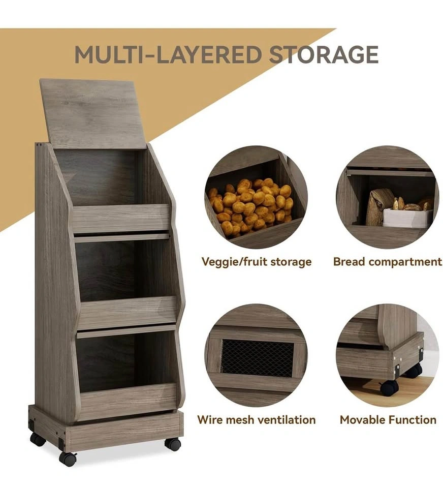 Versatile wood rolling storage cart. Has three tiers for all your kitchen or pantry storage needs. Top compartment has a lid. Middle and bottom compartments have mesh inserts. Moves easily with wheels. Measures about 38 inches tall, 15.7 inches wide, and 13.2 inches deep.