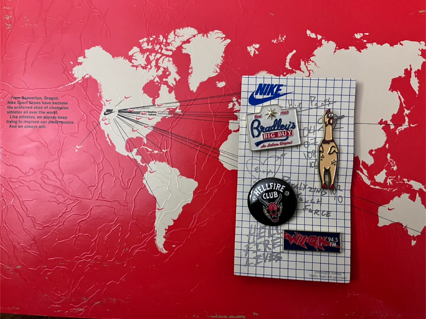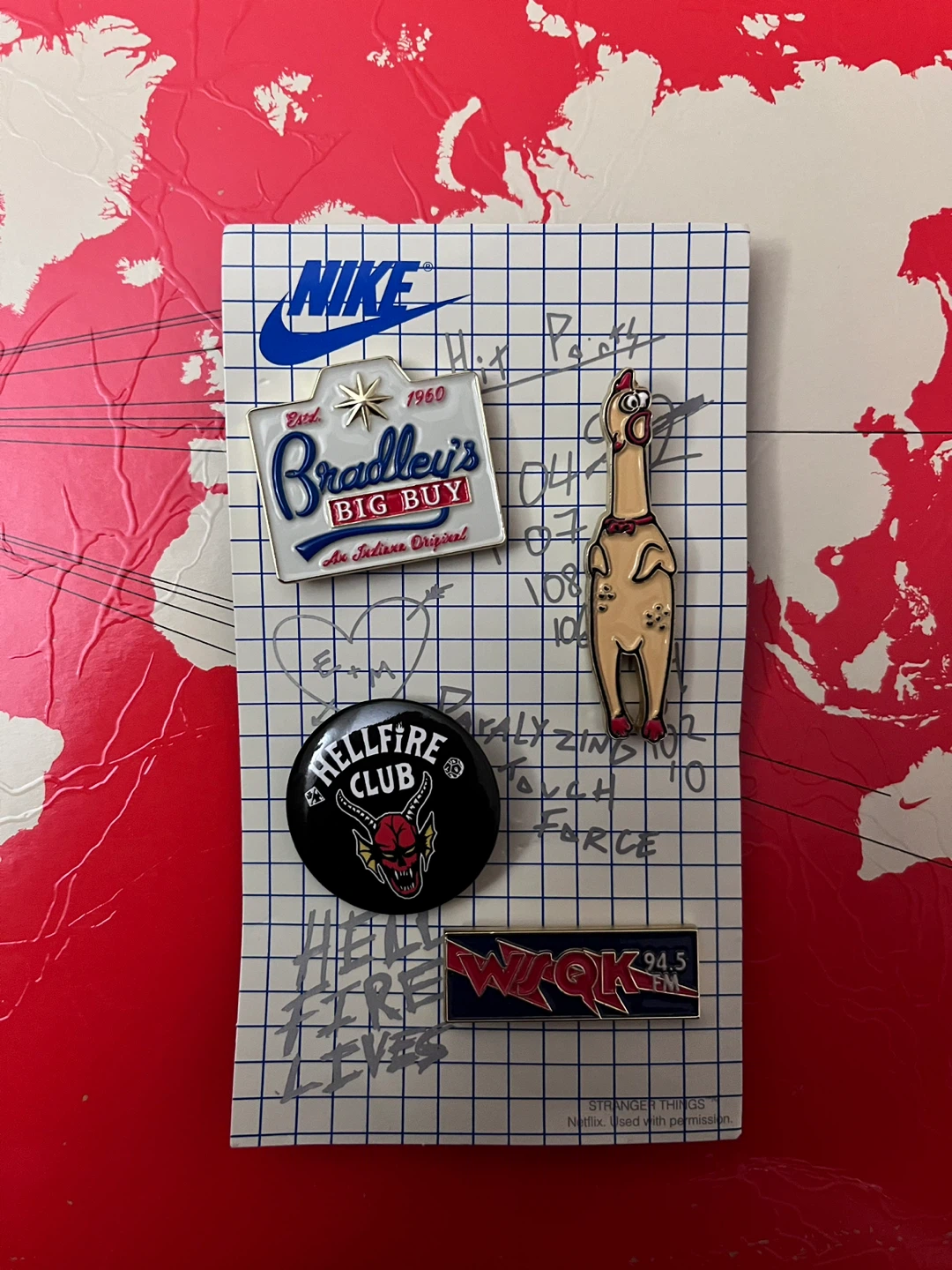 Selling the limited collection of pins from Nike x Stranger Things collab. Pins include Bradley's Big Buy, Hellfire Club, a rubber chicken, and WQKC 94.5 FM