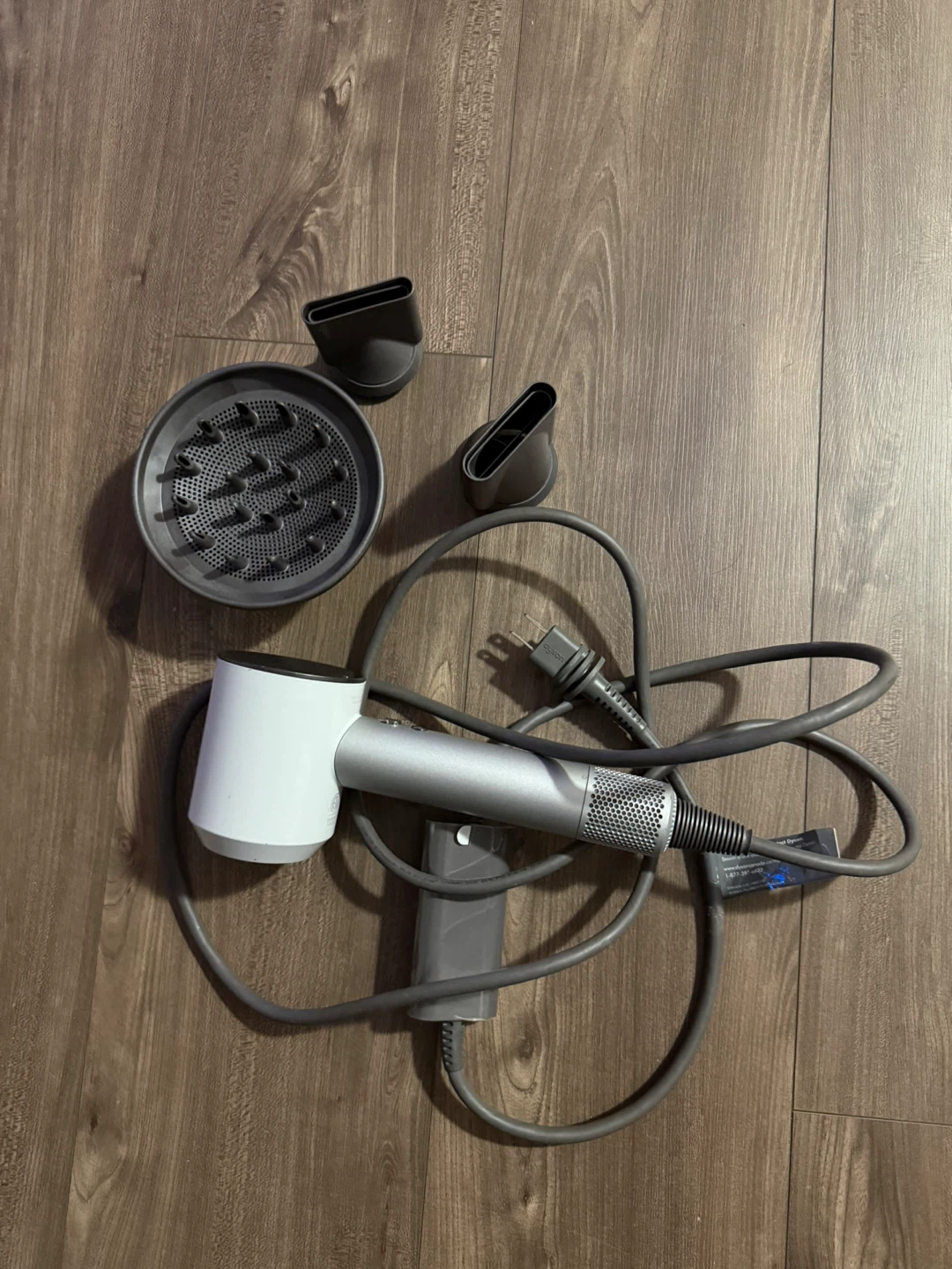 This is a Dyson Supersonic hair dryer in white and silver. It comes with a concentrator nozzle, diffuser, and smoothing nozzle. Powerful and fast drying! It's great for all hair types.