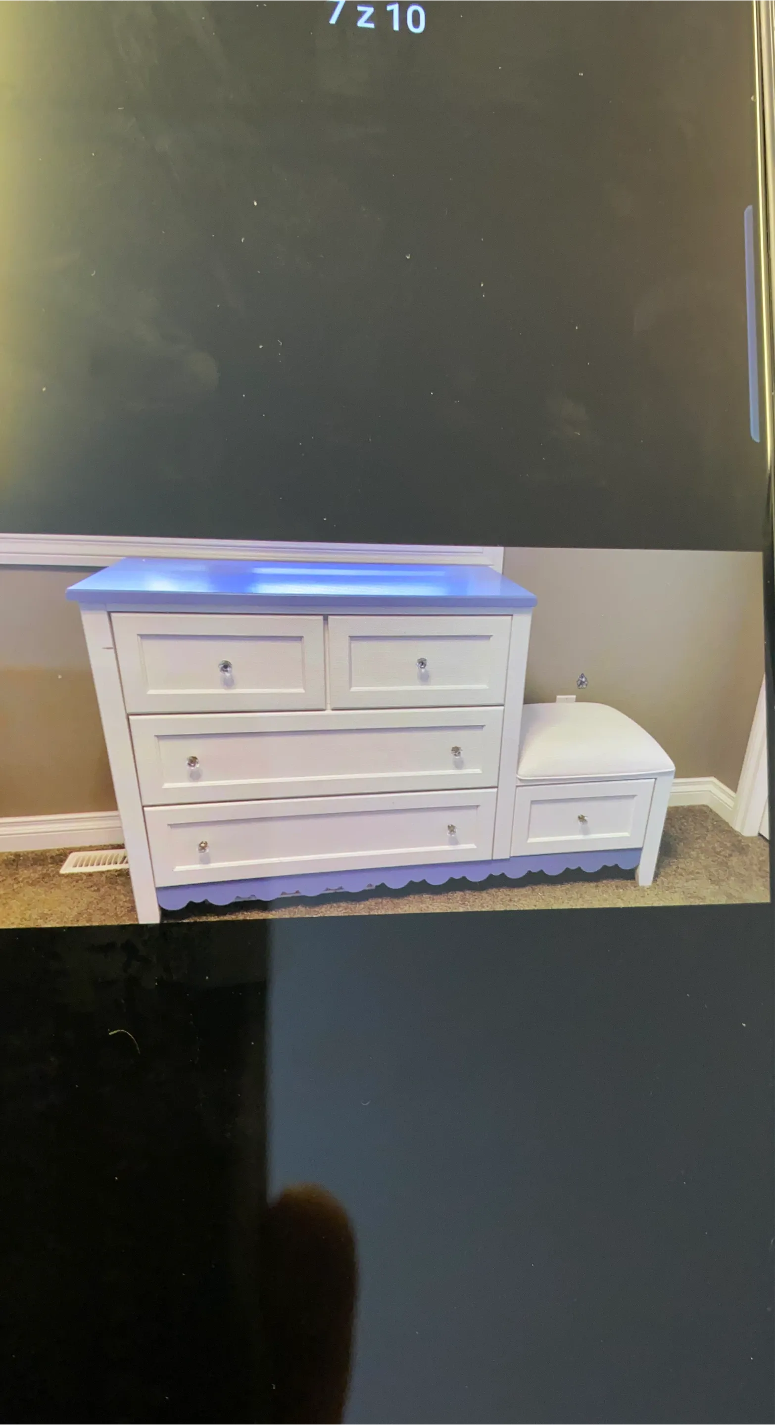 This is a white dresser with a built-in cushioned bench. It has clear crystal drawer knobs and a scalloped purple trim. Great for a child's room or nursery storage!