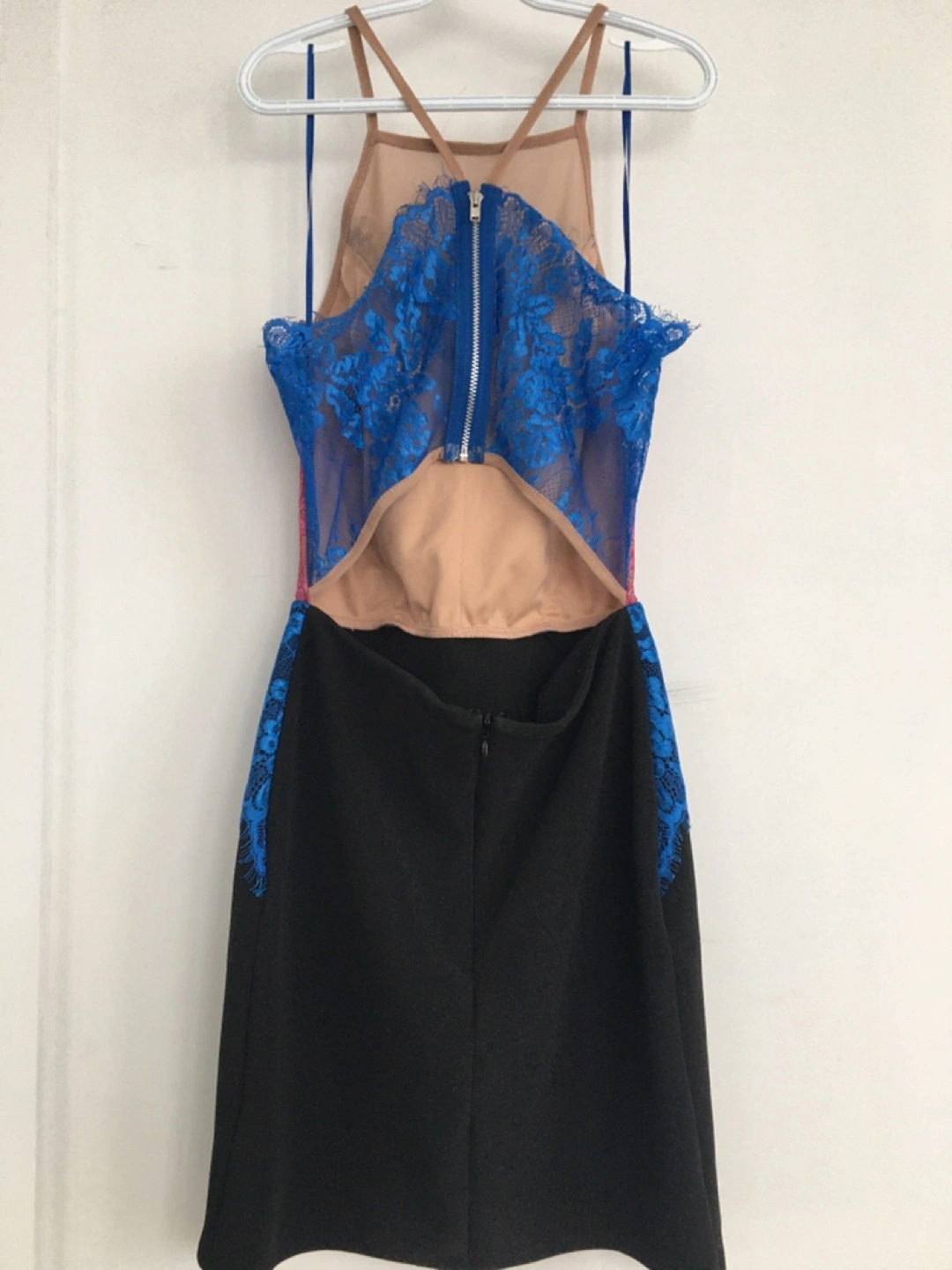 This is a TOPSHOP mini dress with intricate blue lace detailing on the bodice. It features a mesh overlay and cut-out details at the waist. The skirt is black.