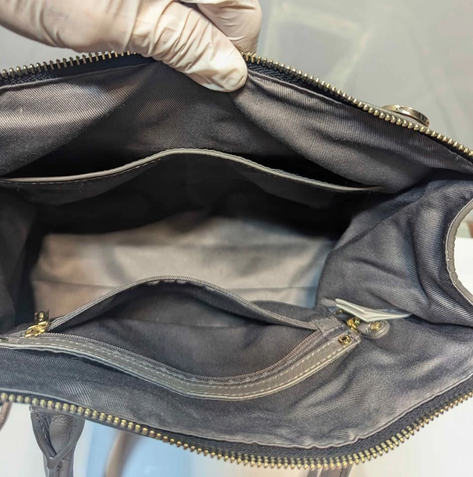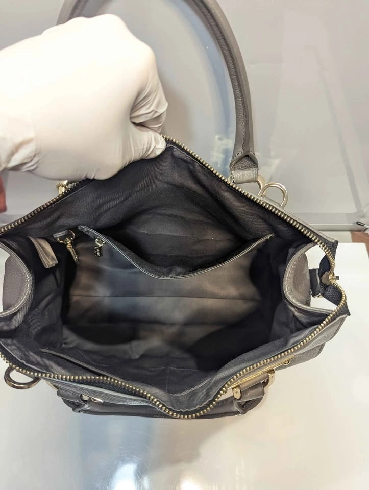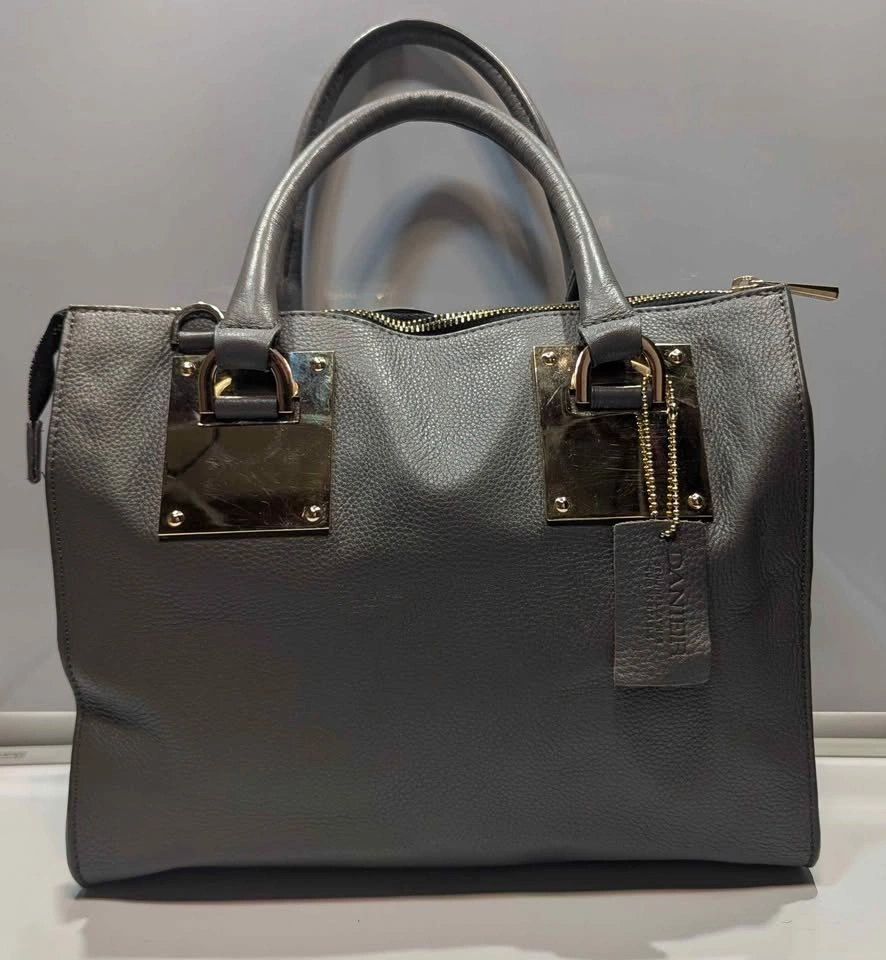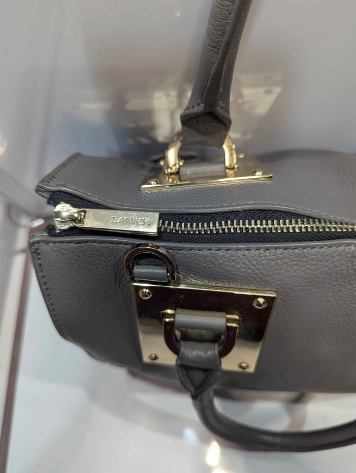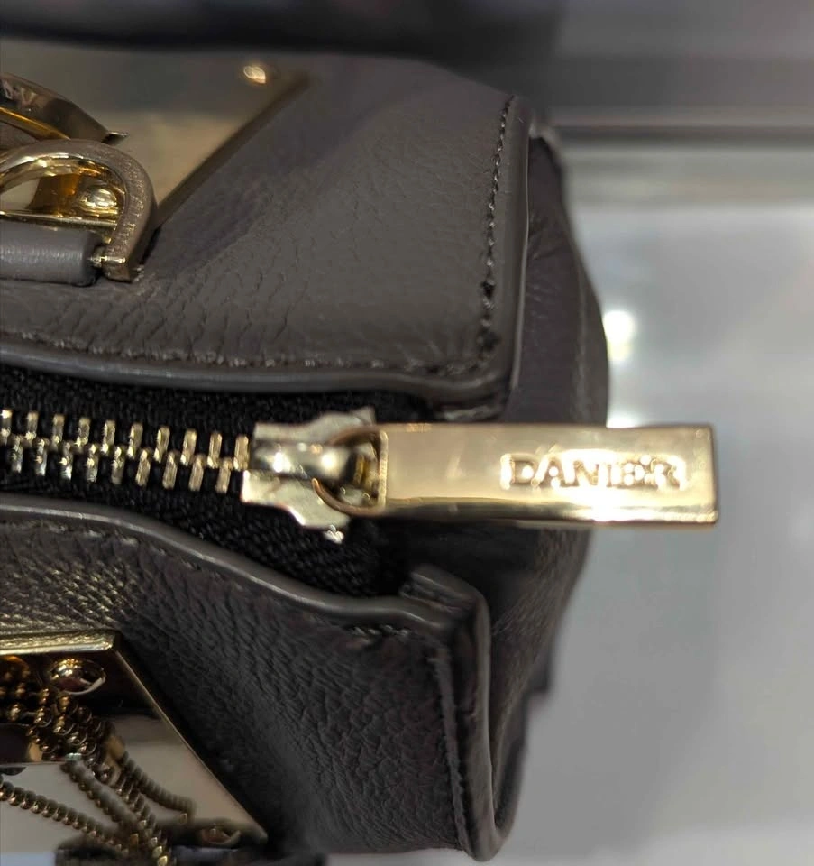 Signature Hardware: Bold, square gold-plated handle anchors and branded "Danier" zipper pulls add a touch of modern luxury.