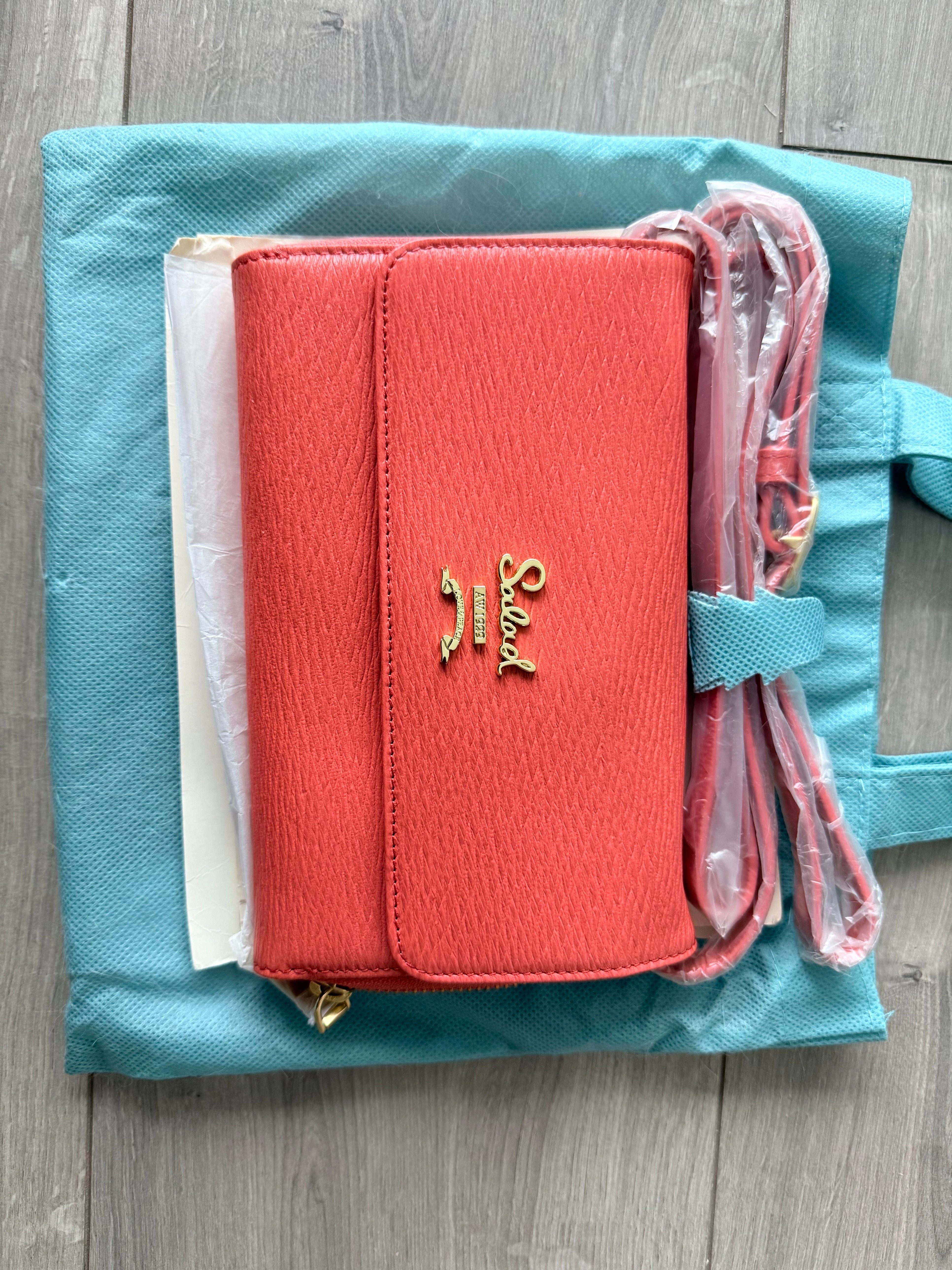 SALAD leather crossbody / wallet-style bag in coral red colour.