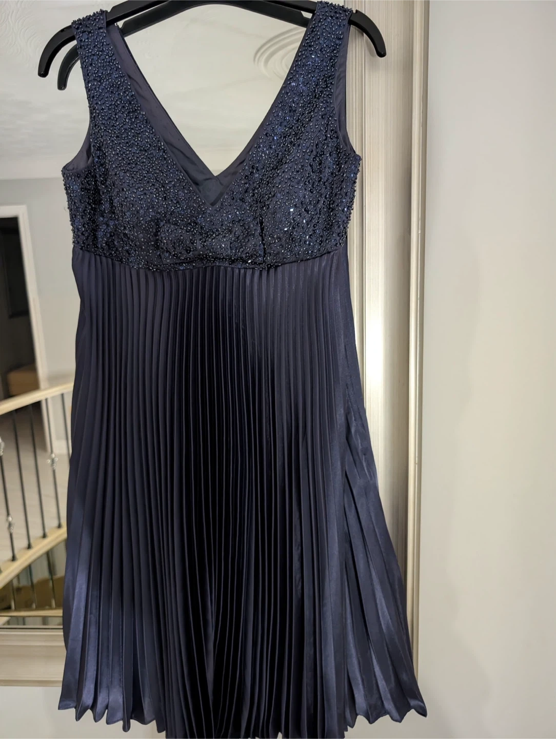 This navy dress features a V-neckline with beaded detailing on the bodice. The skirt is pleated and made of polyester. The lining is acetate. It's a stylish choice for an evening out!