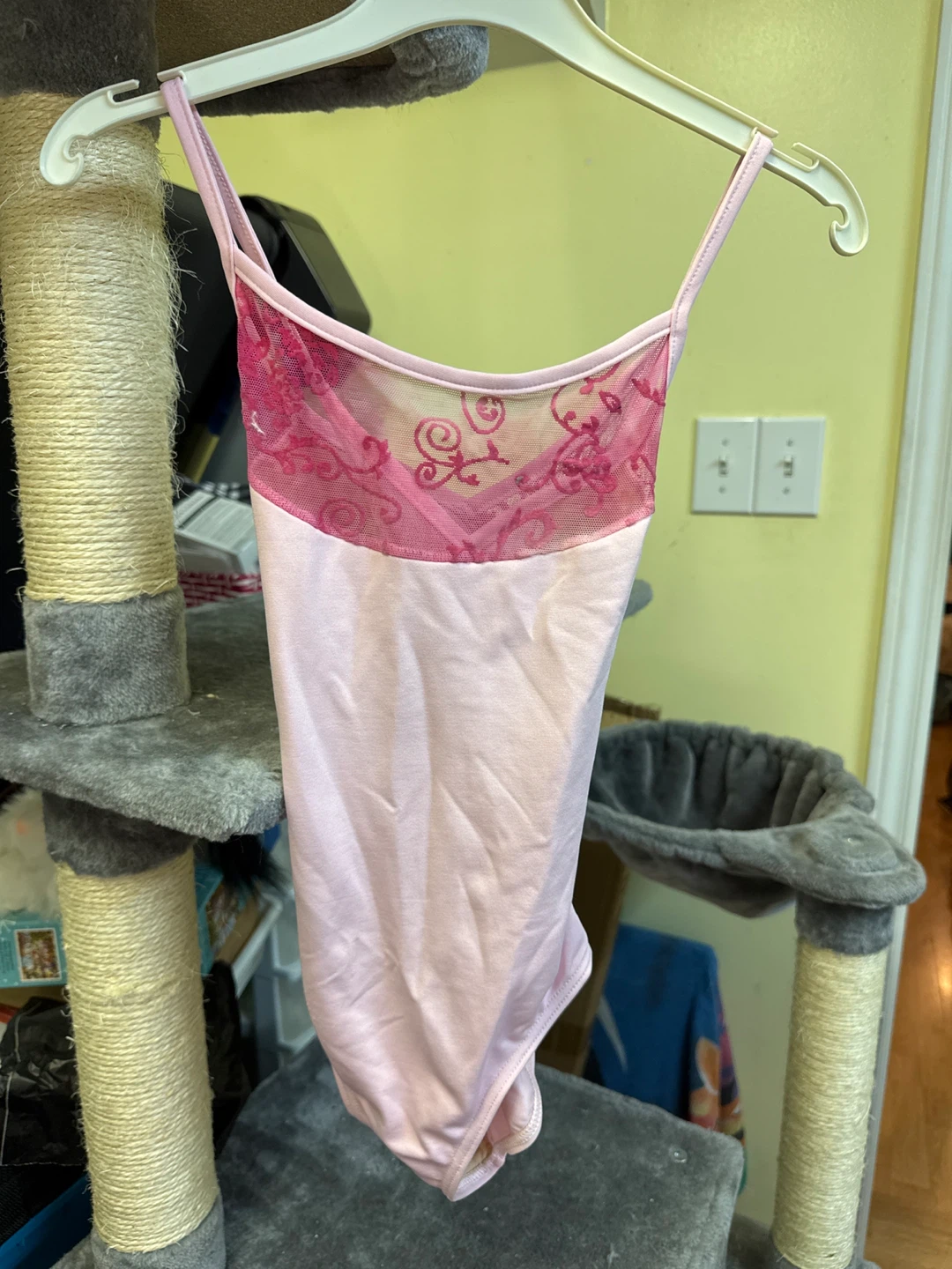Pink leotard from Gilda Marx. Made in Canada. Size is 8/10. Features a lace detail on the neckline. Perfect for dance or gymnastics!
