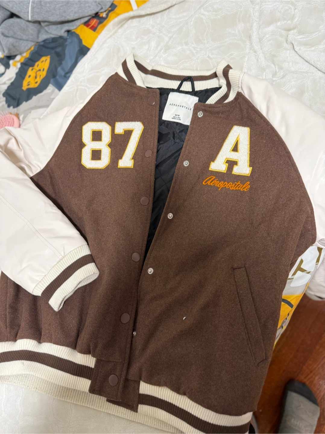 Aeropostale varsity jacket with "87 A" design. It's a size M/M with wool body and faux leather sleeves. Features button closure and striped ribbed cuffs.