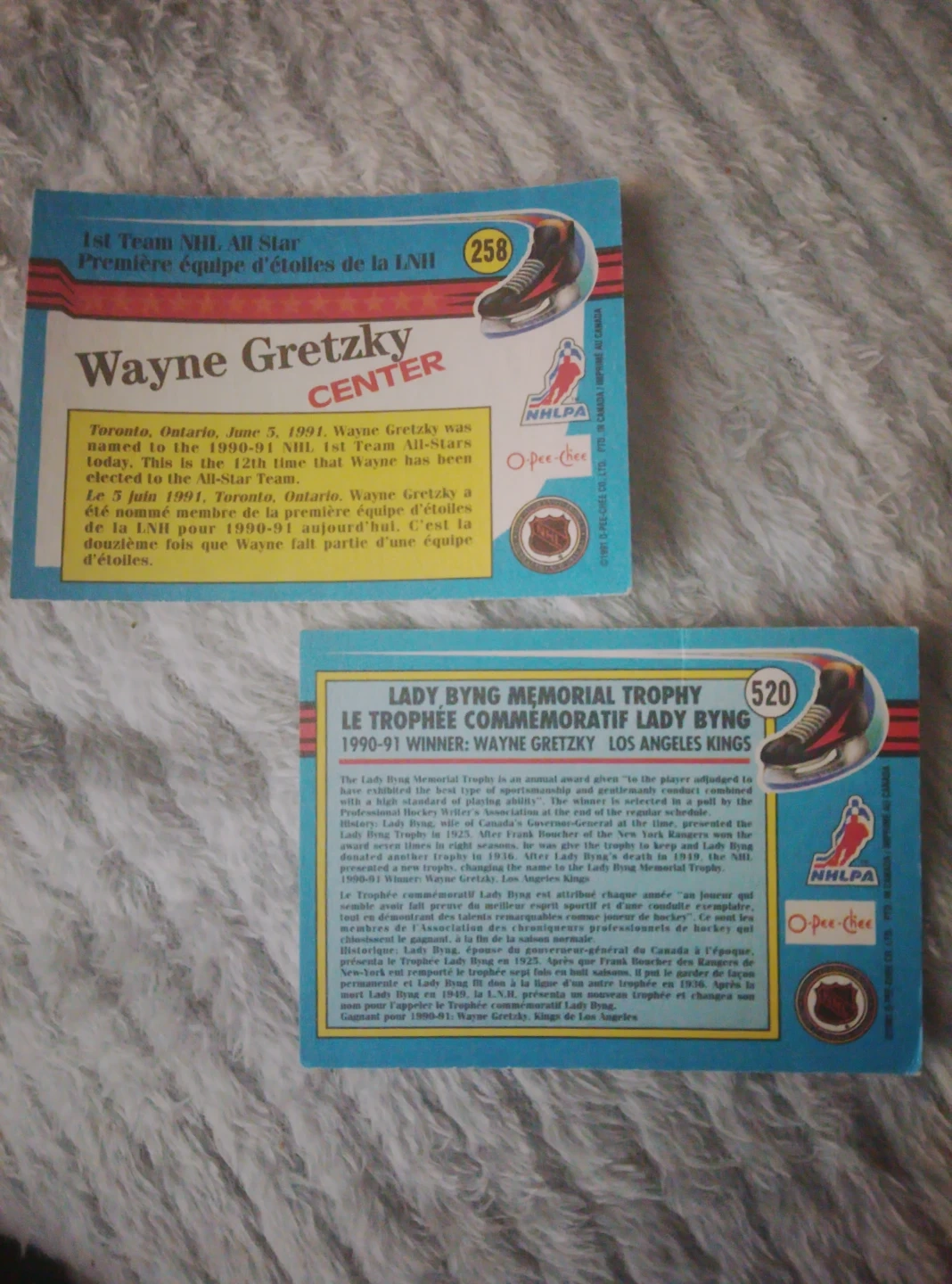 Two O-Pee-Chee Wayne Gretzky hockey cards from 1990-91. One features the All-Star and the other the Lady Byng Trophy winner. These cards are from the 1990-91 season. A great addition for any hockey card collector!