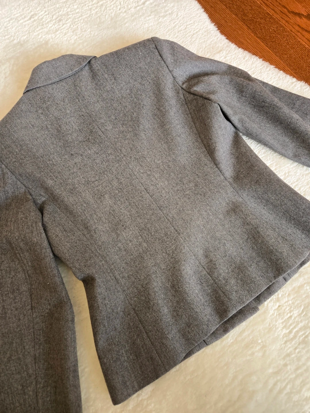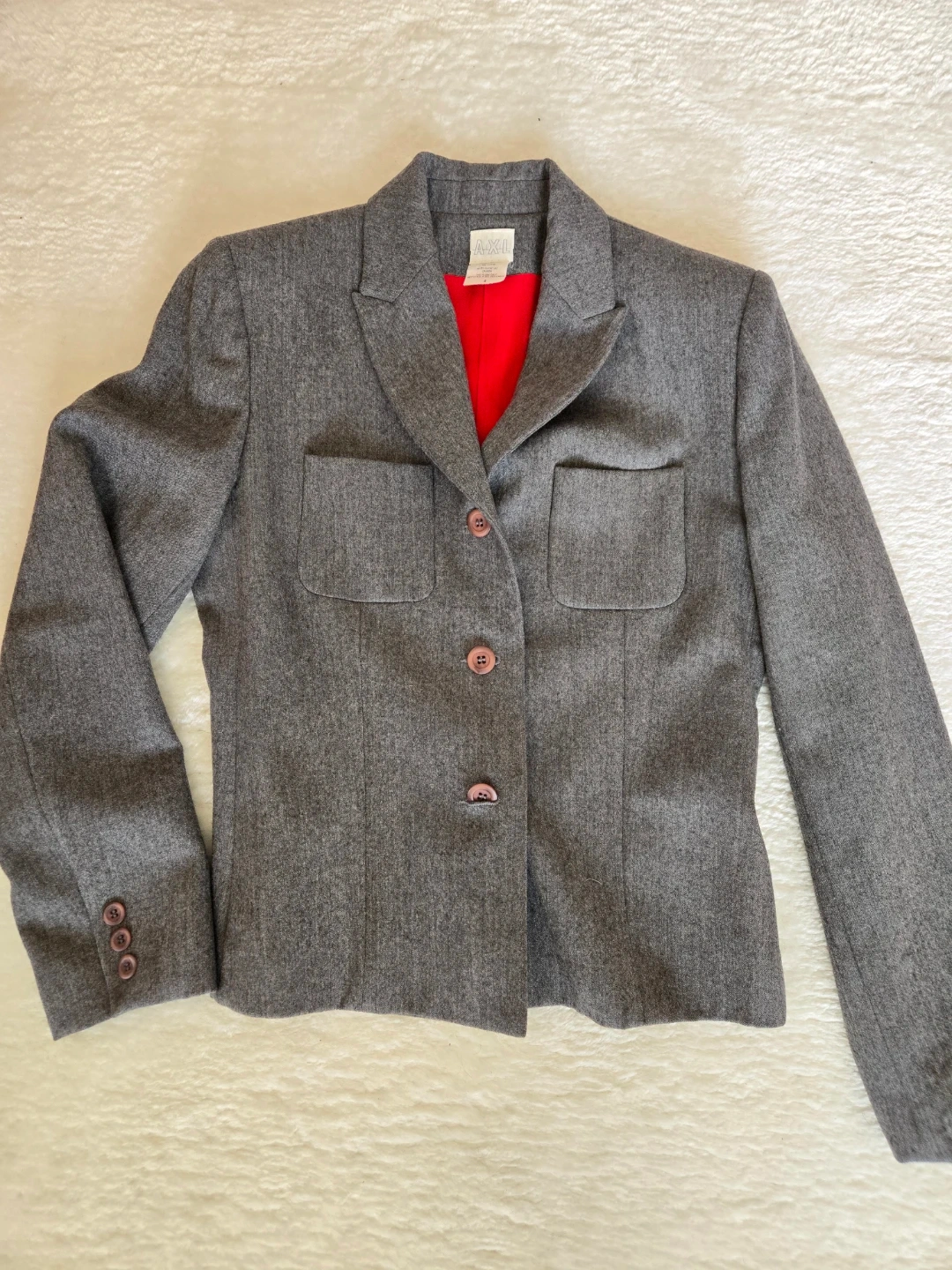 This Gray suit comes in a classic grey tweed with a vibrant red lining. It features front flap pockets and button closures- Pencil long skirt. A stylish addition to any wardrobe!