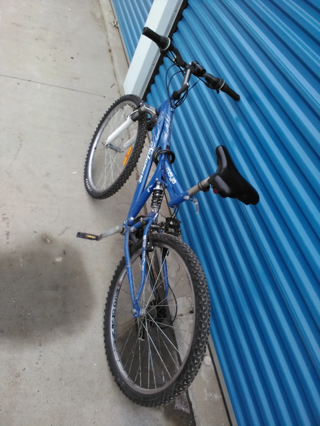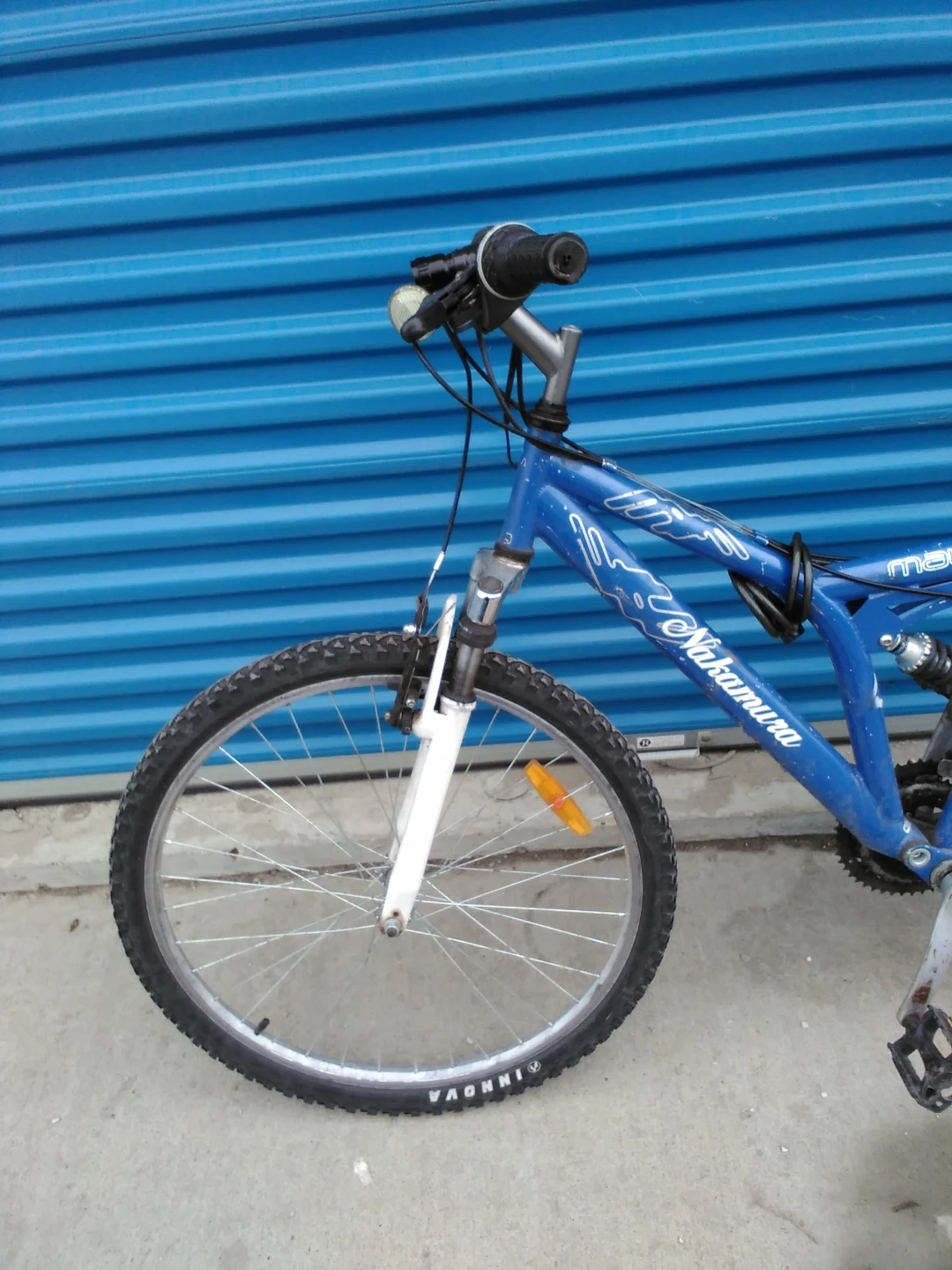 This is a blue Nakamura mountain bike. It has front suspension and knobby tires. The frame is blue and it comes with a black seat and pedals.