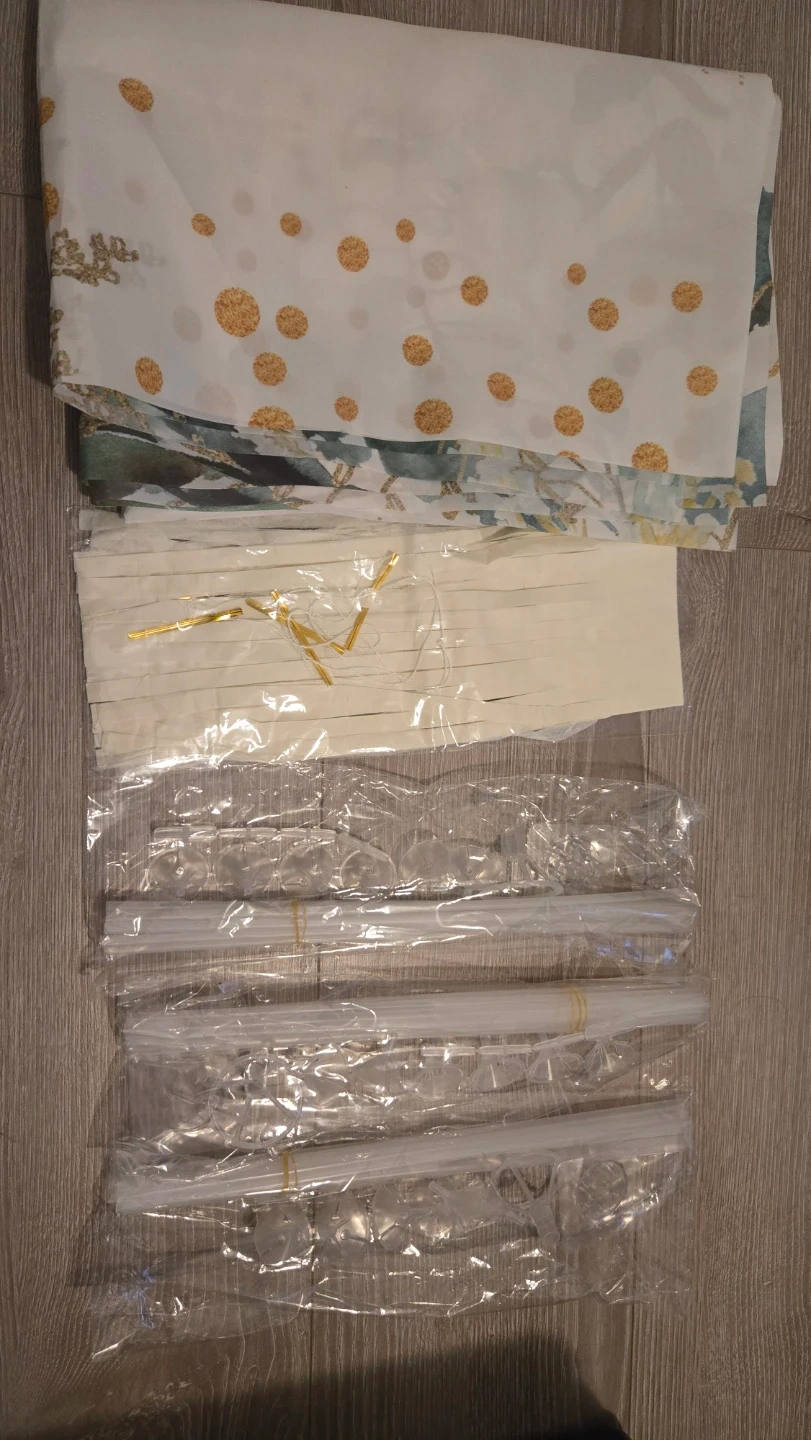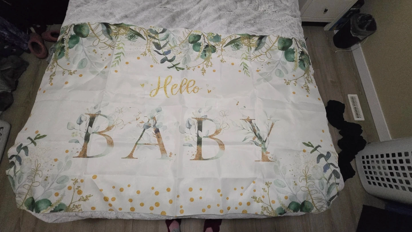 Brand new baby shower banner, 3 new balloon stands and a steamer banner. Was purchased for my baby shower but we forgot it and never used them. Banner shown on a queen sized bed for size reference