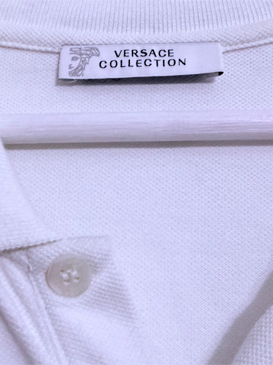 Versace Collection white polo shirt with black trim. Features the iconic Medusa head embroidery. Size XXL. Made in Tunisia.