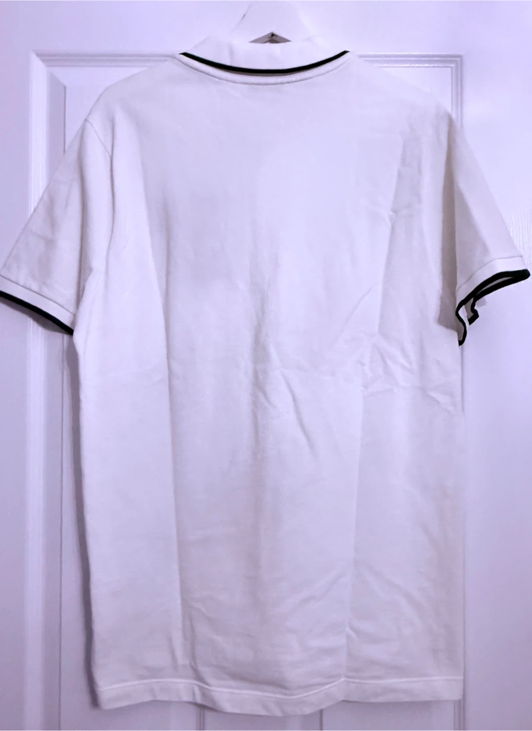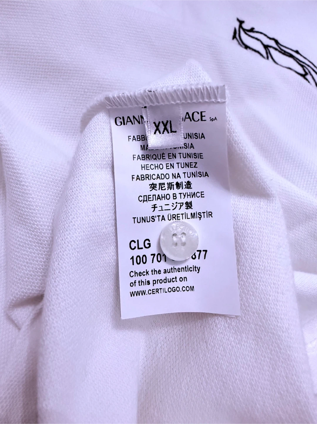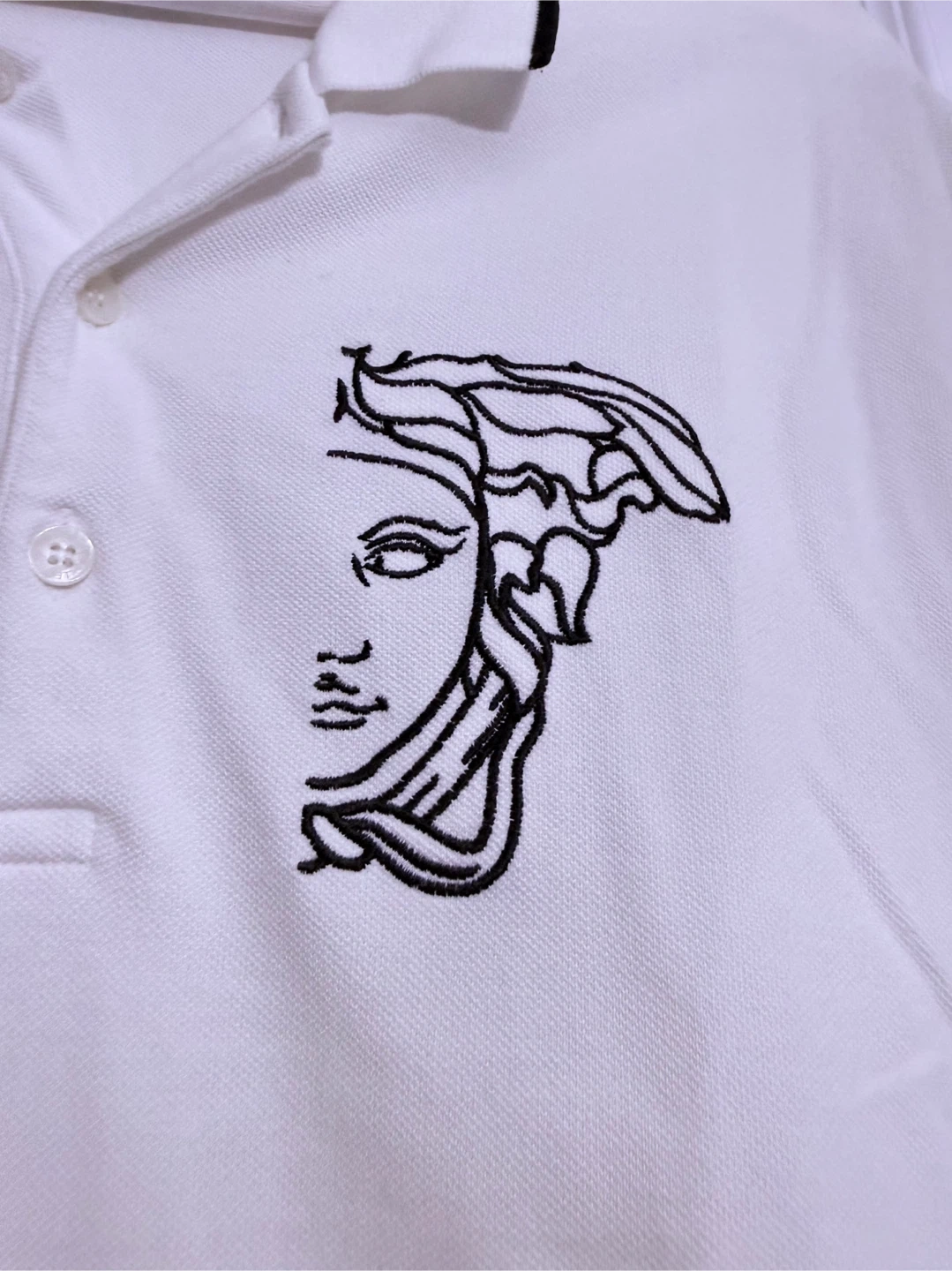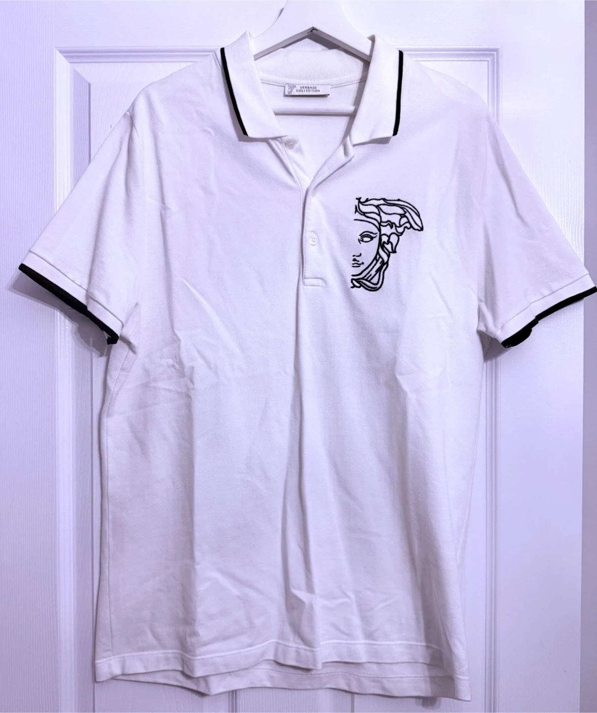 Versace Collection white polo shirt with black trim. Features the iconic Medusa head embroidery. Size XXL. Made in Tunisia.