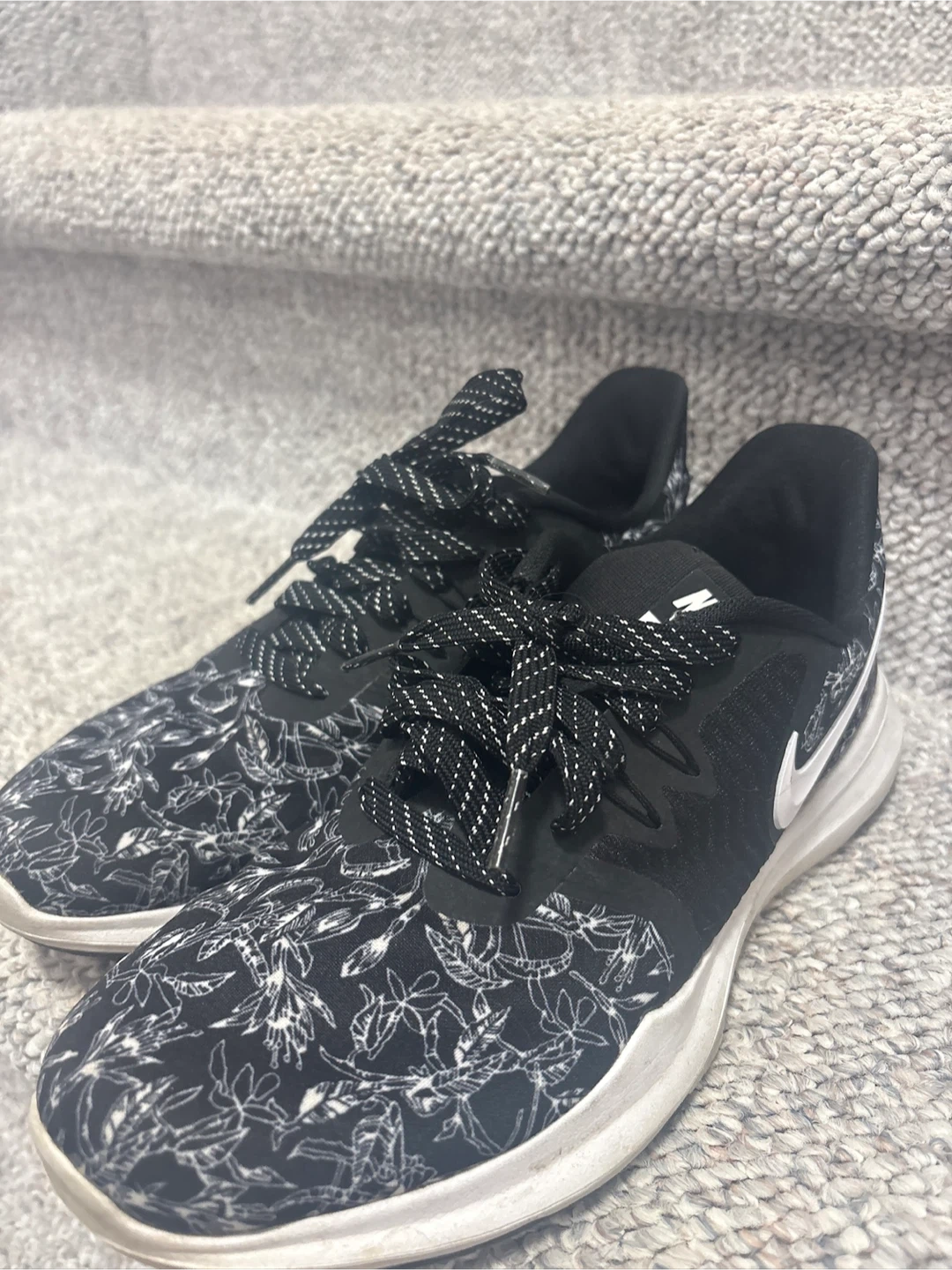 These Nike running shoes are black with a white floral pattern. They feature a lace-up closure and a cushioned sole. Size is 7.5. Pick up cash only