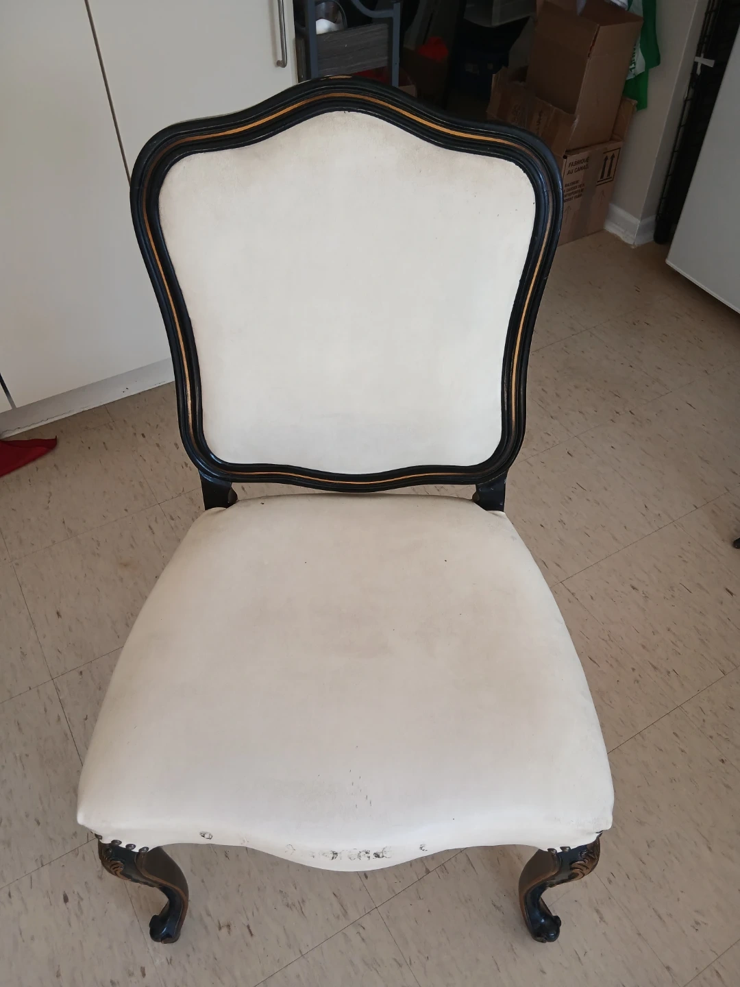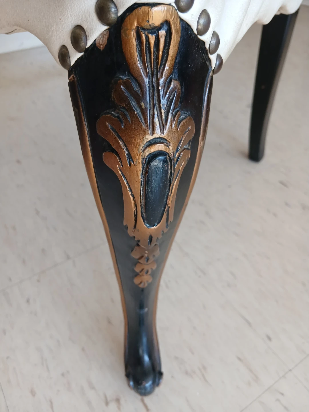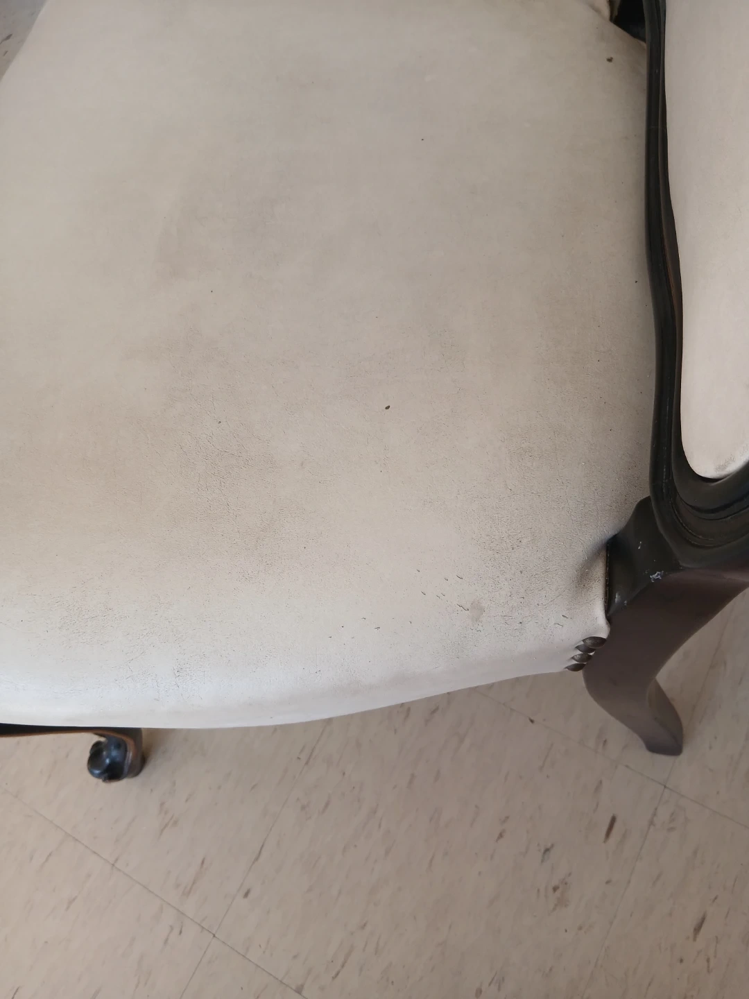 This accent chair boasts a classic design with beautiful ornate carvings on its legs. The upholstery is a light cream colour and shows some signs of wear. It's a charming piece that'll add vintage flair to any room.