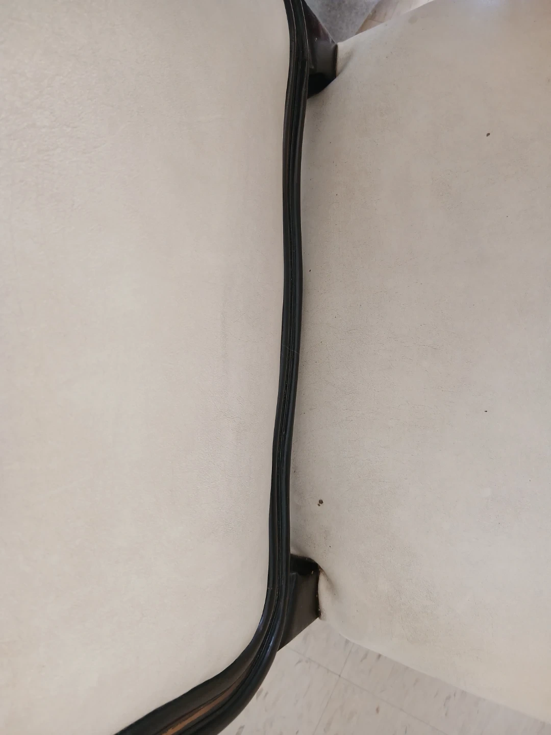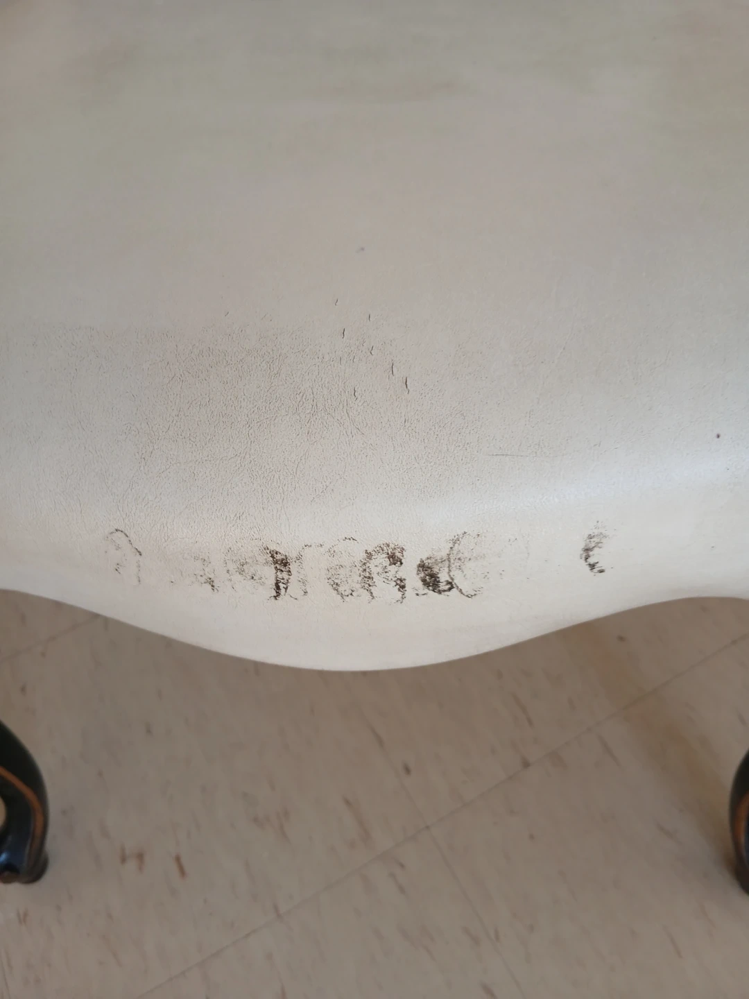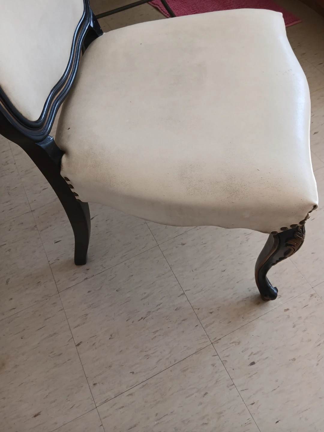This accent chair boasts a classic design with beautiful ornate carvings on its legs. The upholstery is a light cream colour and shows some signs of wear. It's a charming piece that'll add vintage flair to any room.