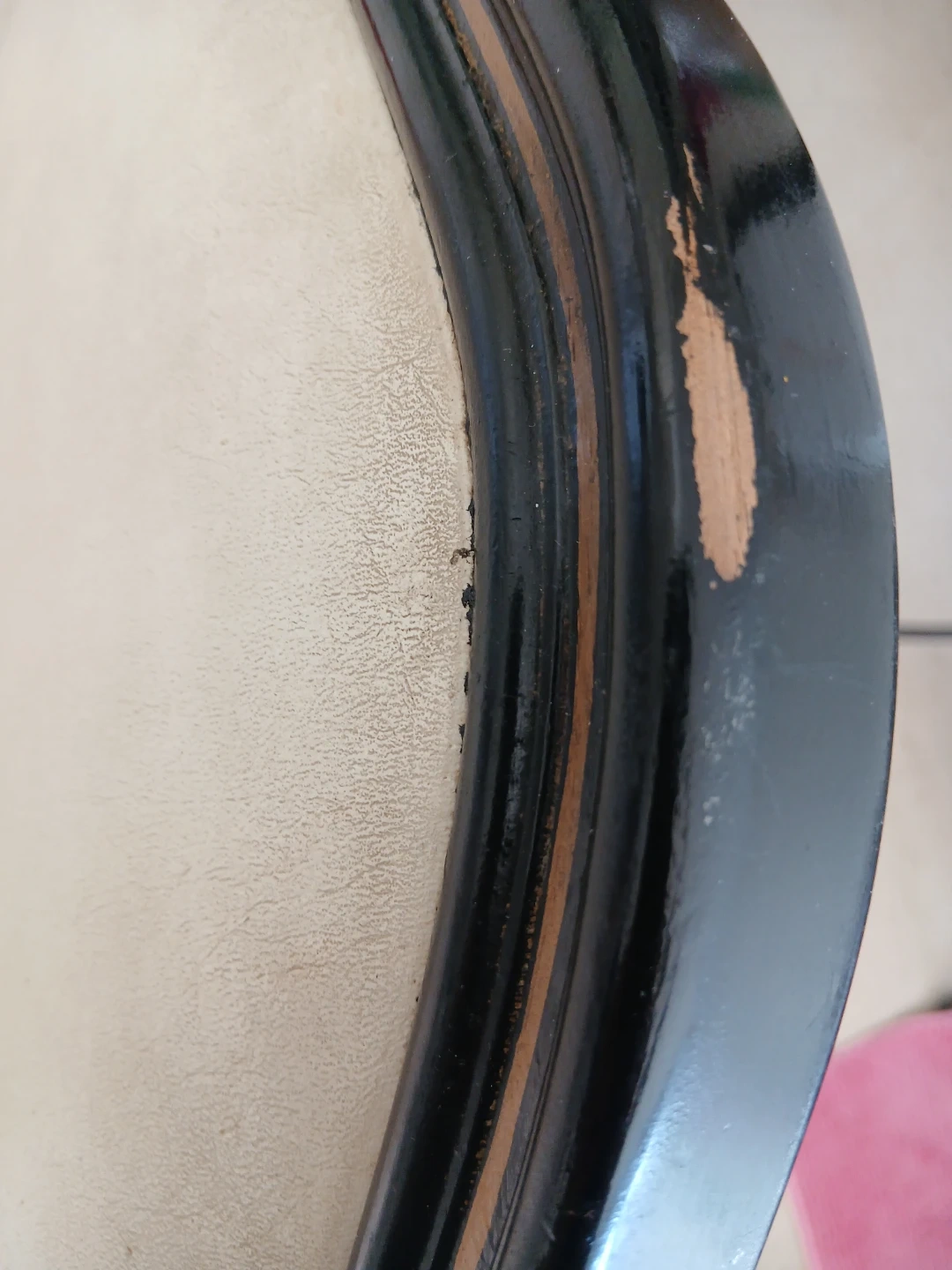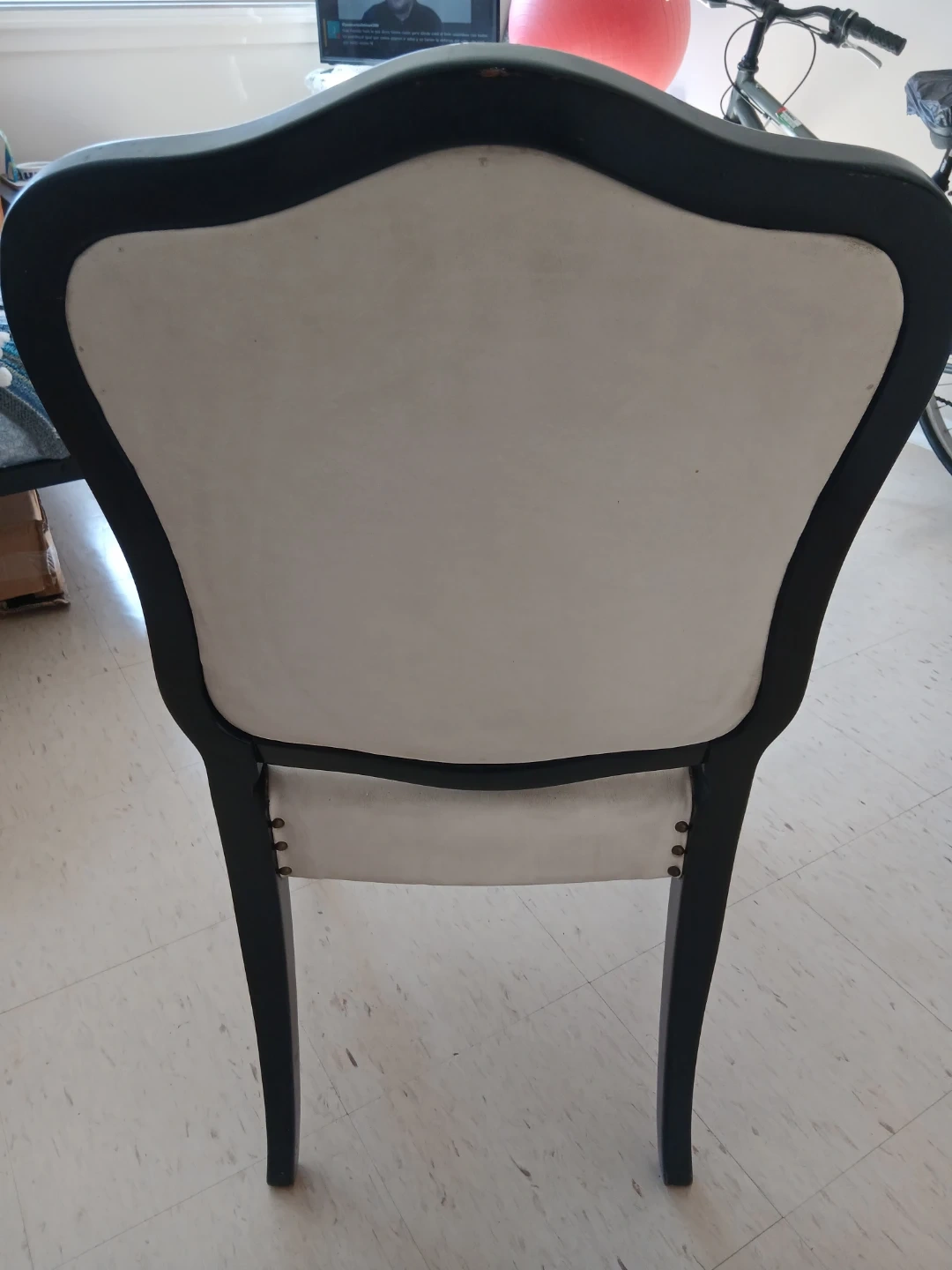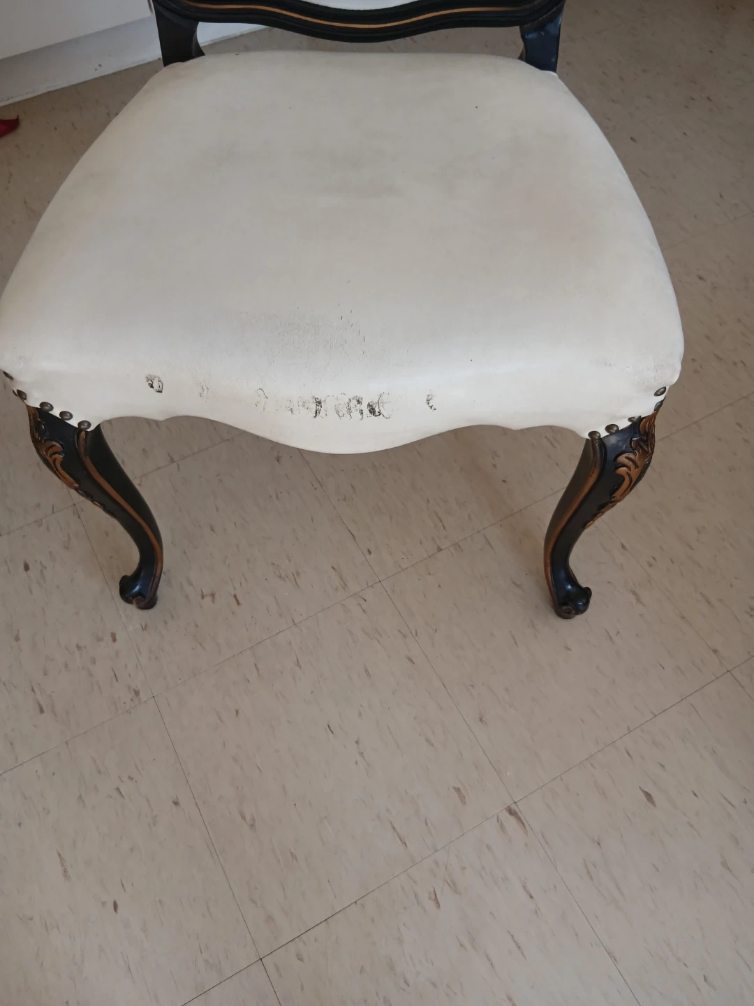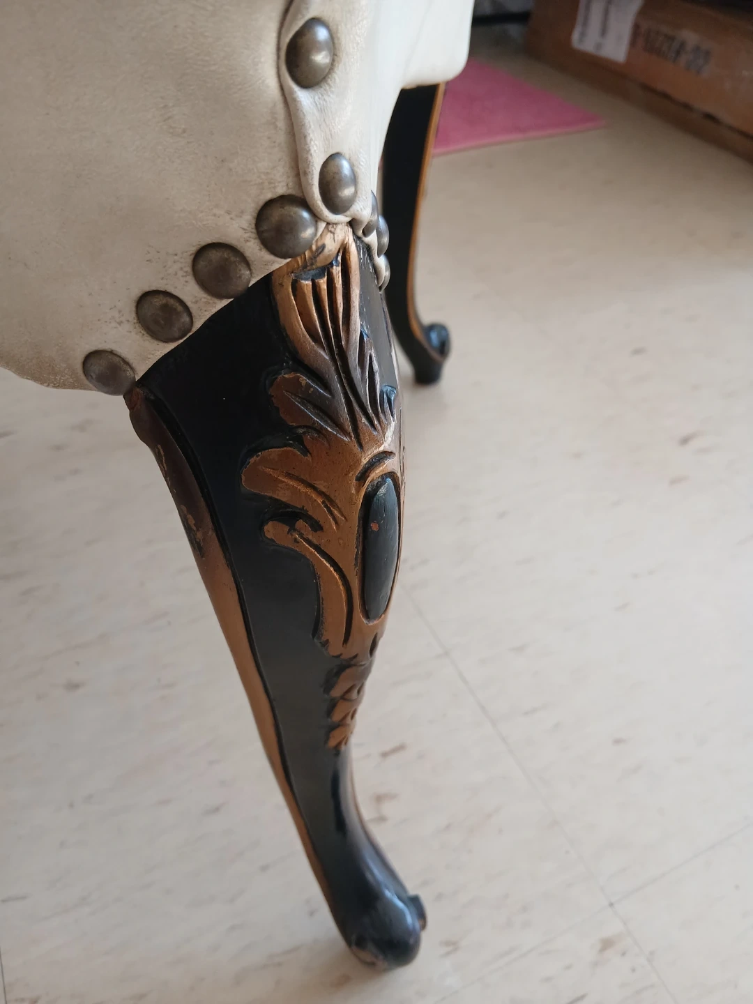 This accent chair boasts a classic design with beautiful ornate carvings on its legs. The upholstery is a light cream colour and shows some signs of wear. It's a charming piece that'll add vintage flair to any room.