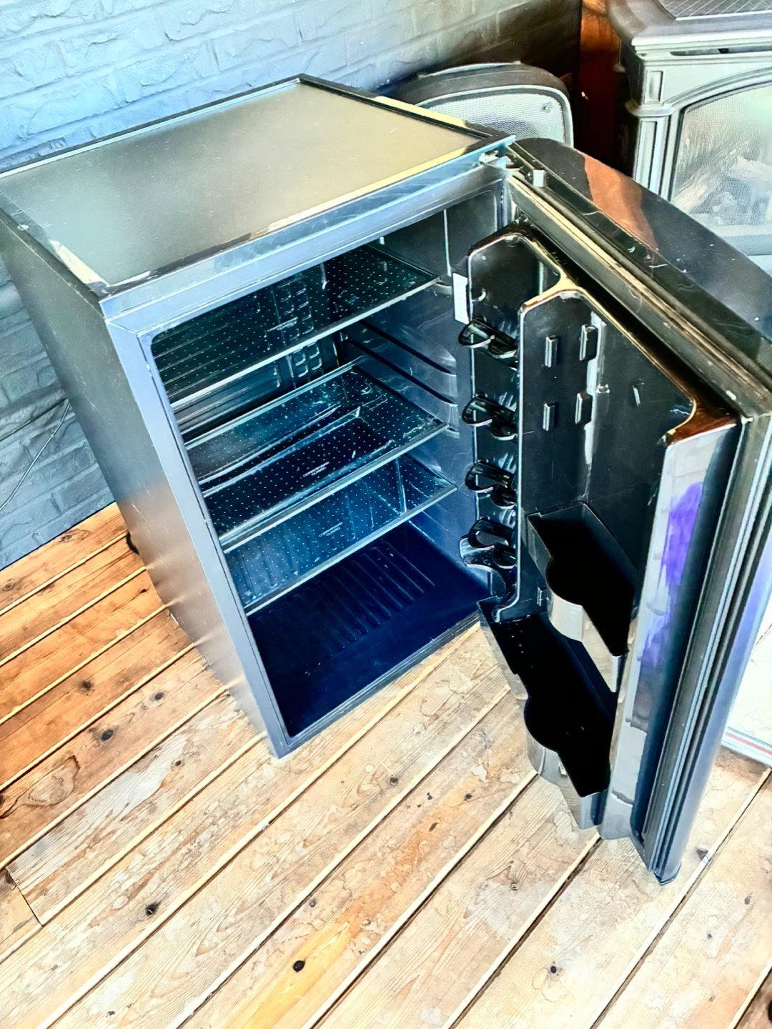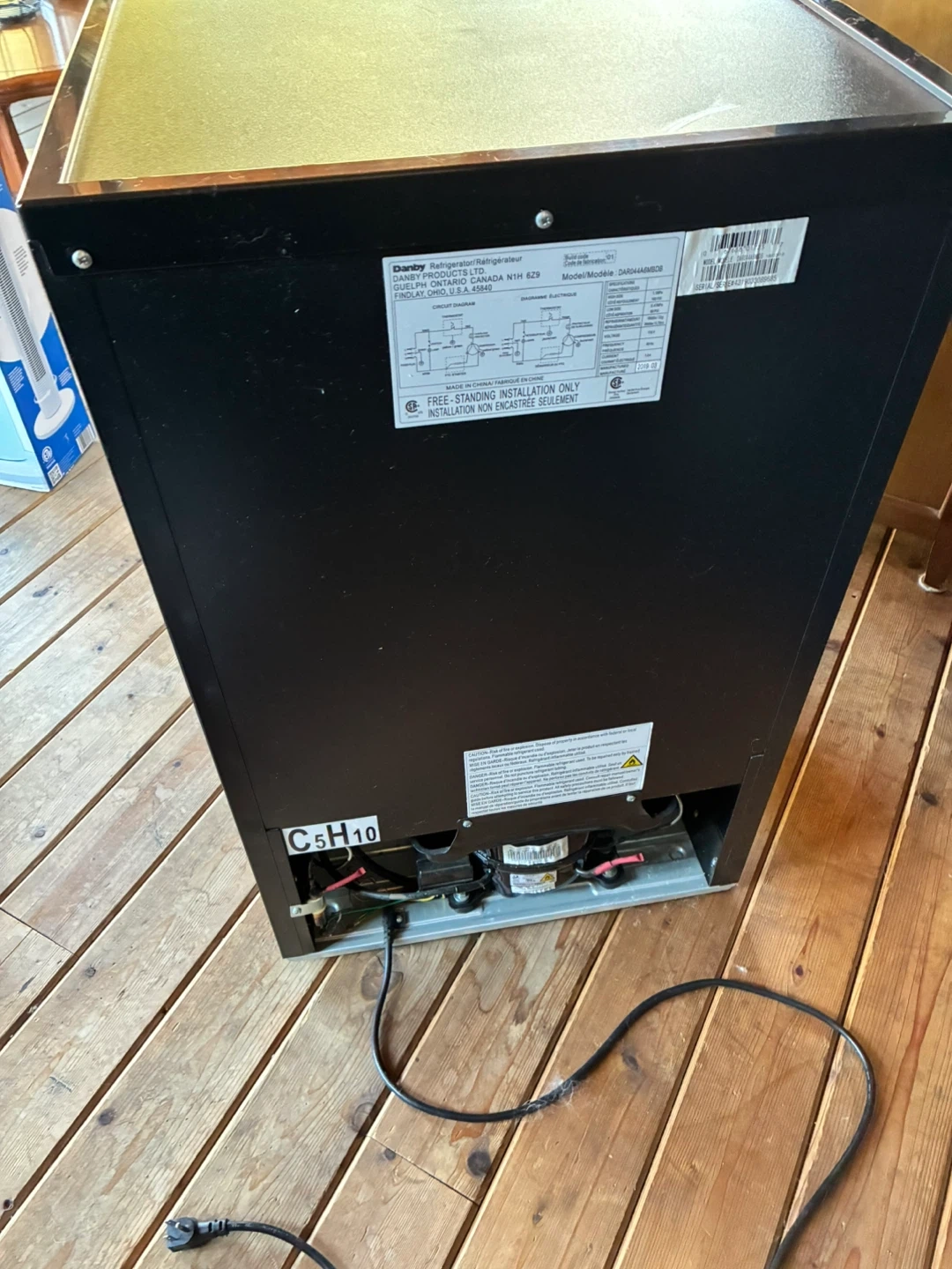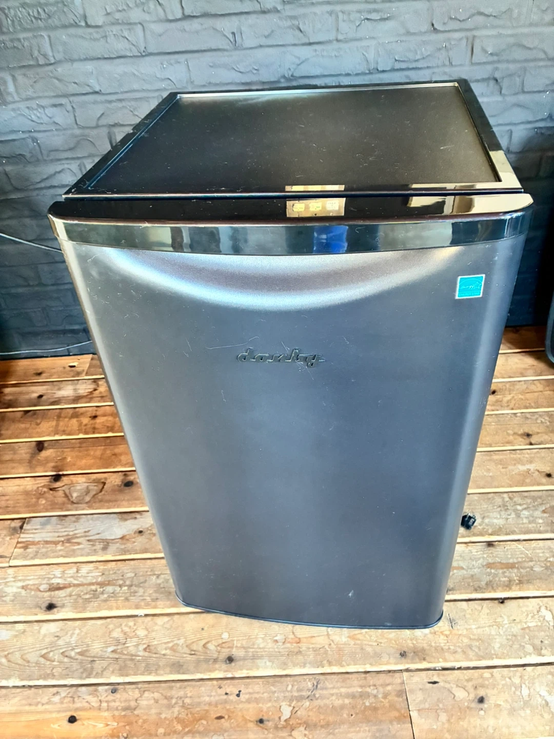 Black Danby mini fridge. It has multiple shelves inside and door compartments. Perfect for a dorm room or office space!