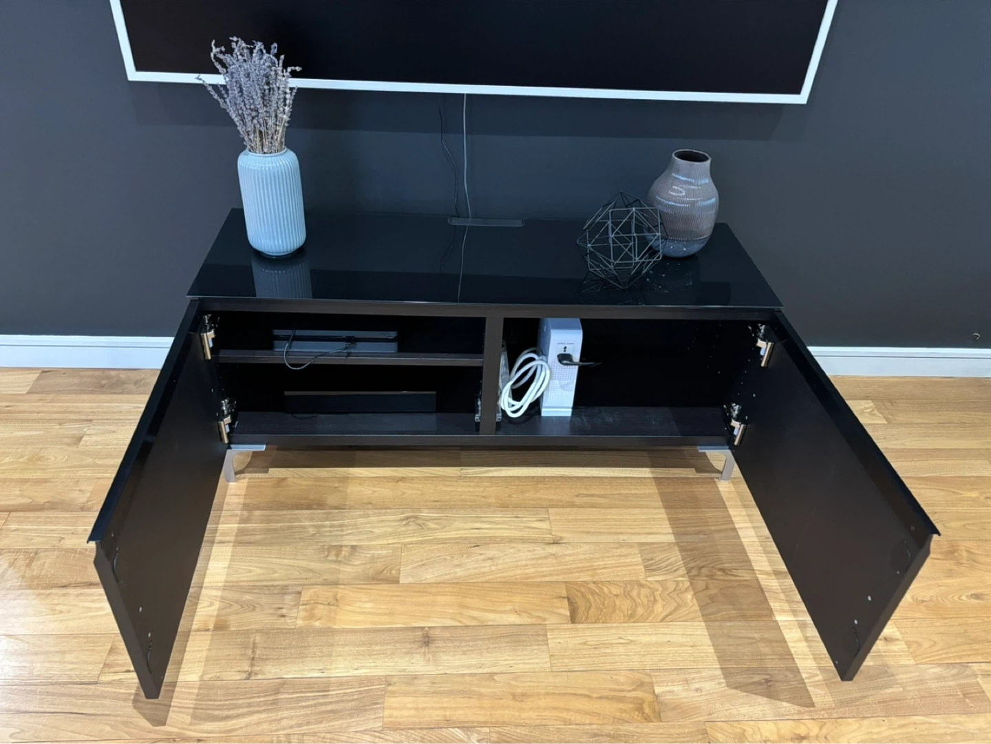 Sleek black TV stand with a glossy glass top. It features two cabinet doors with ample storage inside, perfect for organizing media consoles and accessories. Silver metal legs provide a stylish, modern look. It's ideal for setting up your entertainment area.
