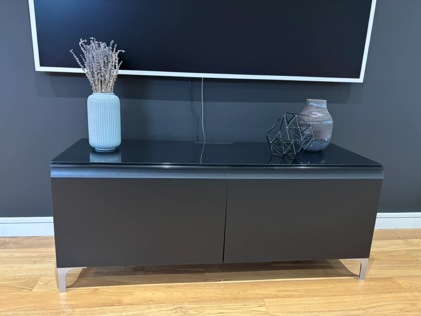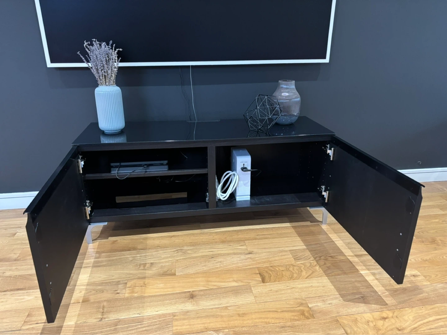 Sleek black TV stand with a glossy glass top. It features two cabinet doors with ample storage inside, perfect for organizing media consoles and accessories. Silver metal legs provide a stylish, modern look. It's ideal for setting up your entertainment area.