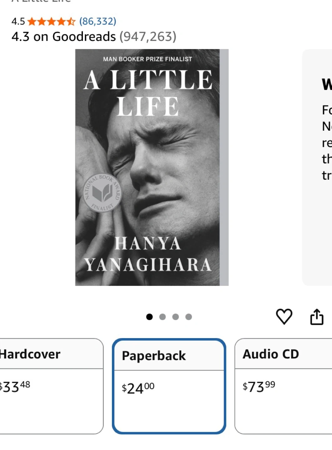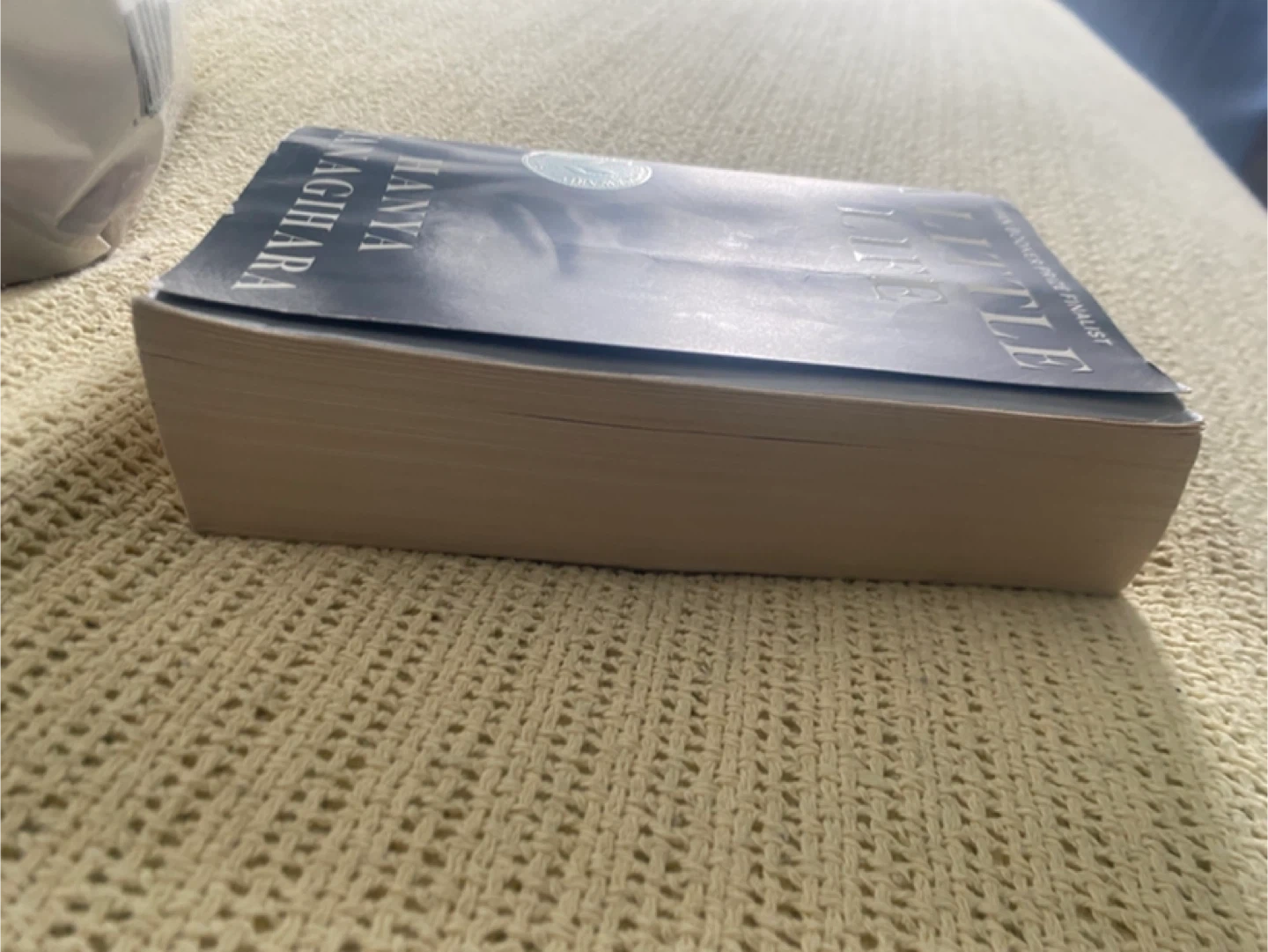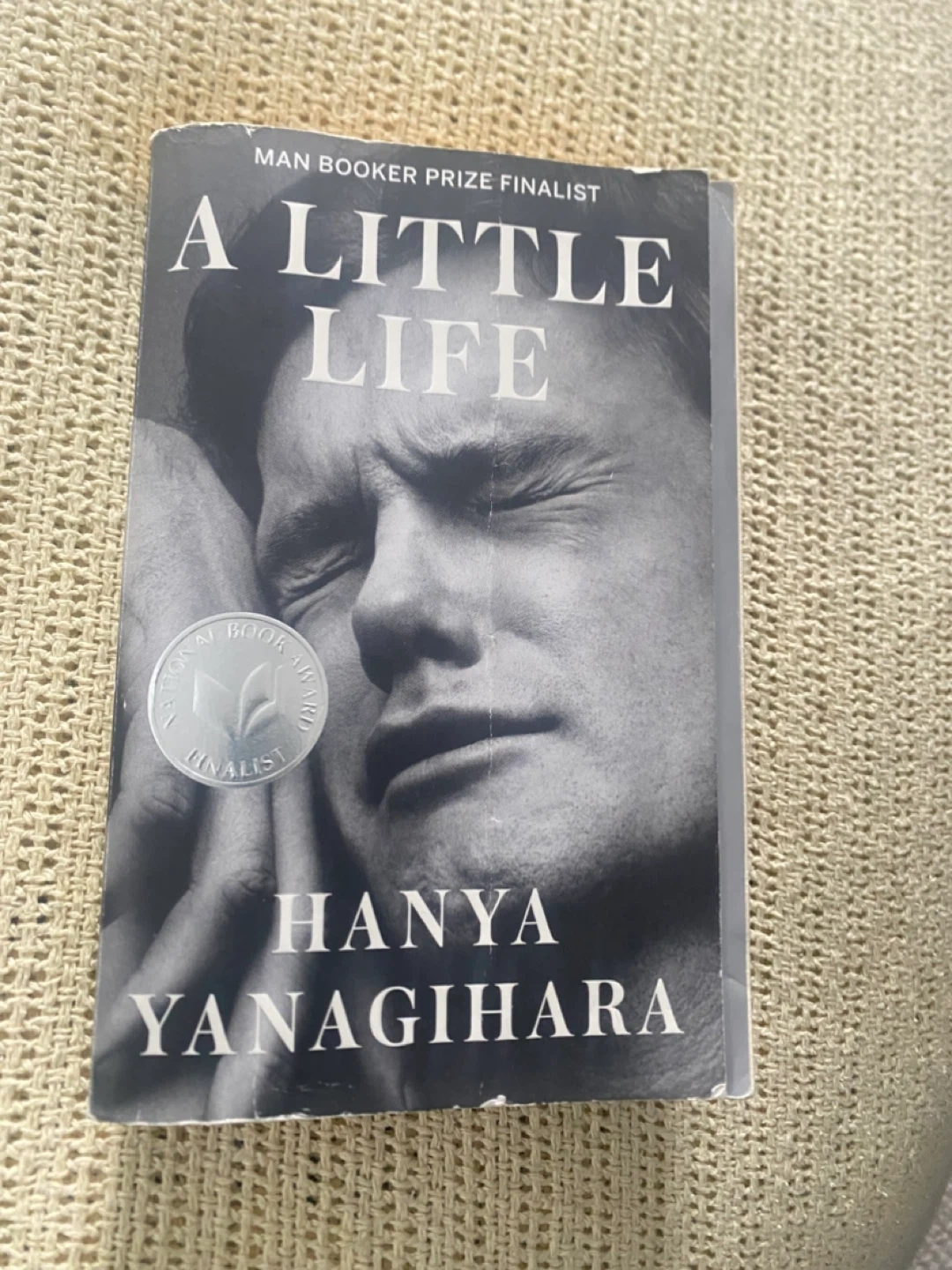 A paperback edition of the novel A Little Life by Hanya Yanagihara. It's been a Man Booker Prize finalist. This book explores profound themes and character development.