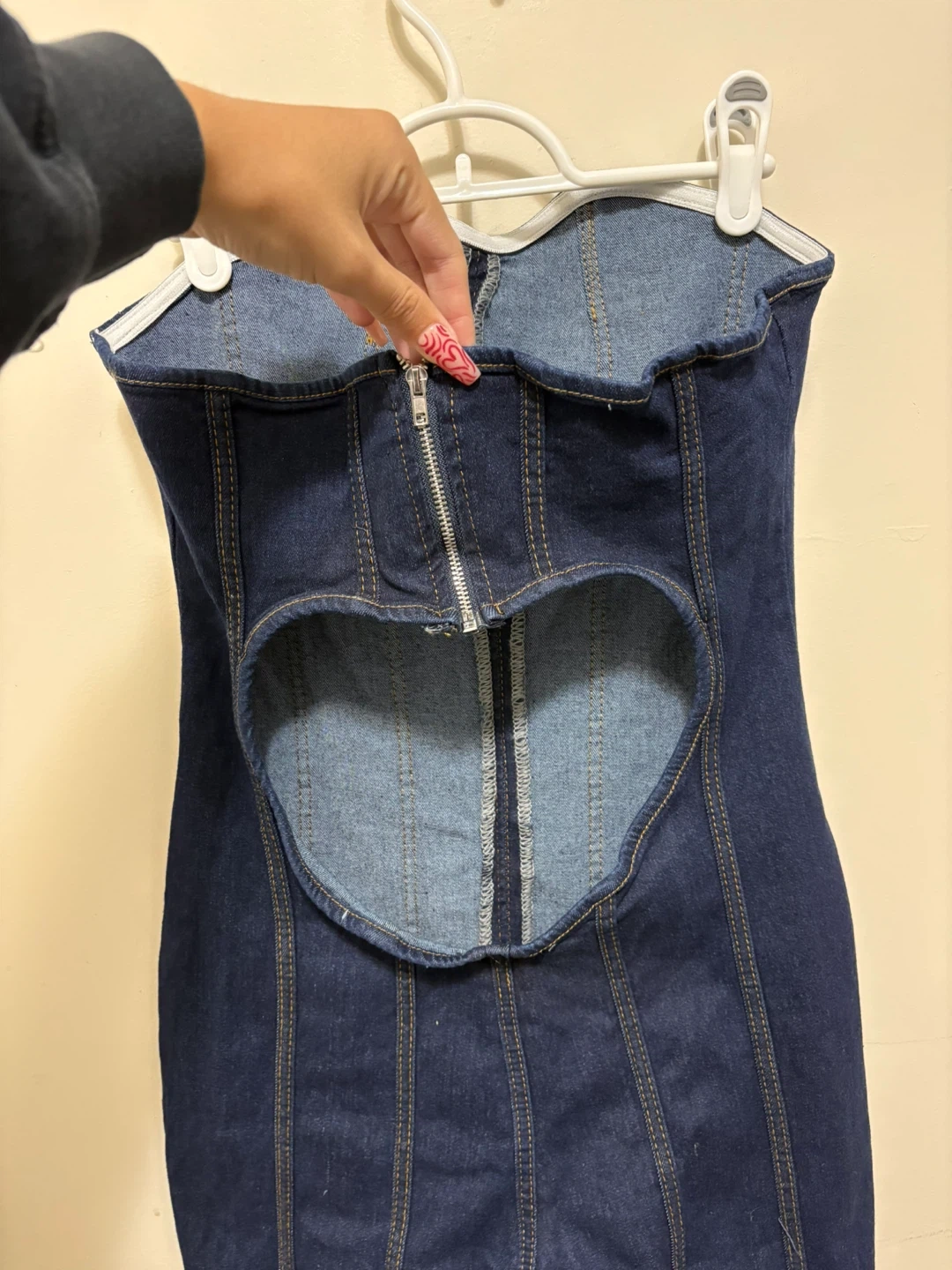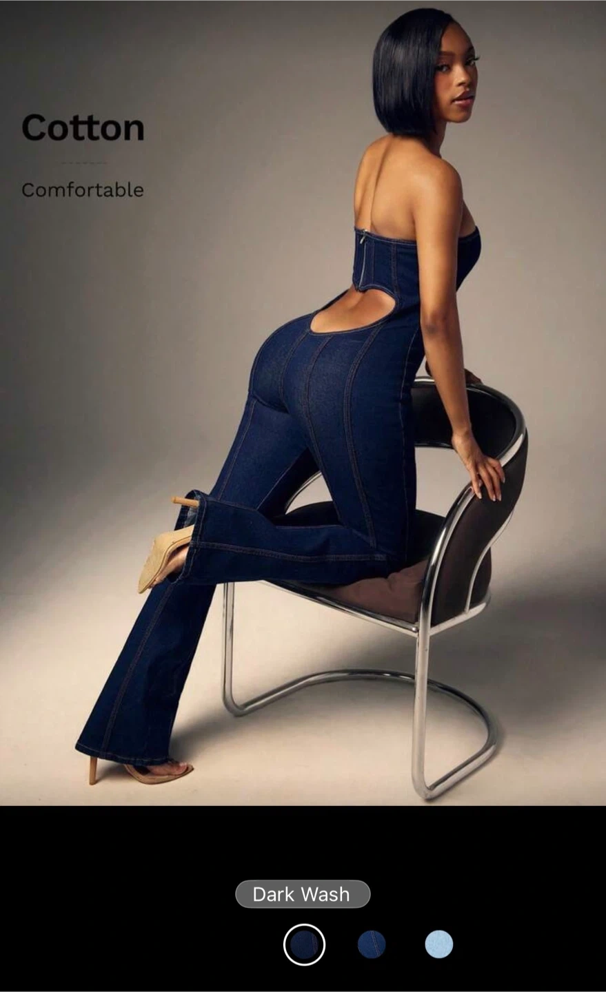 This strapless jumpsuit is made from cotton in a dark wash denim. It features a zip closure at the back and a cutout detail. This piece is comfortable and stylish. Size small. I'm usually a medium but it fits comfy just too big in the top. Bought for $50+shipping.