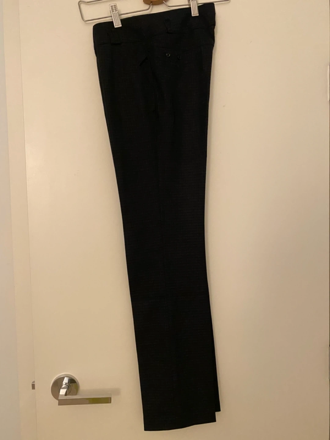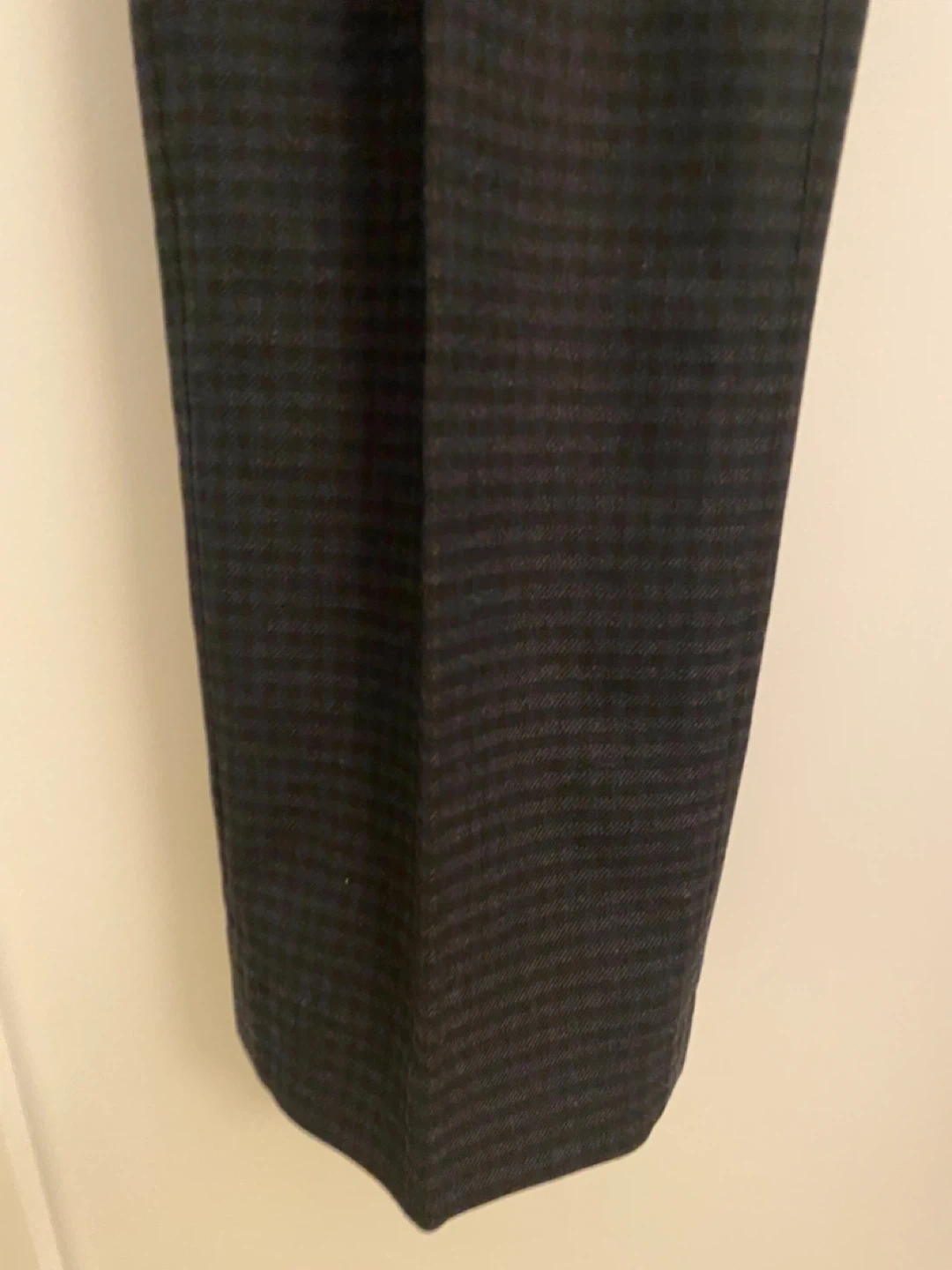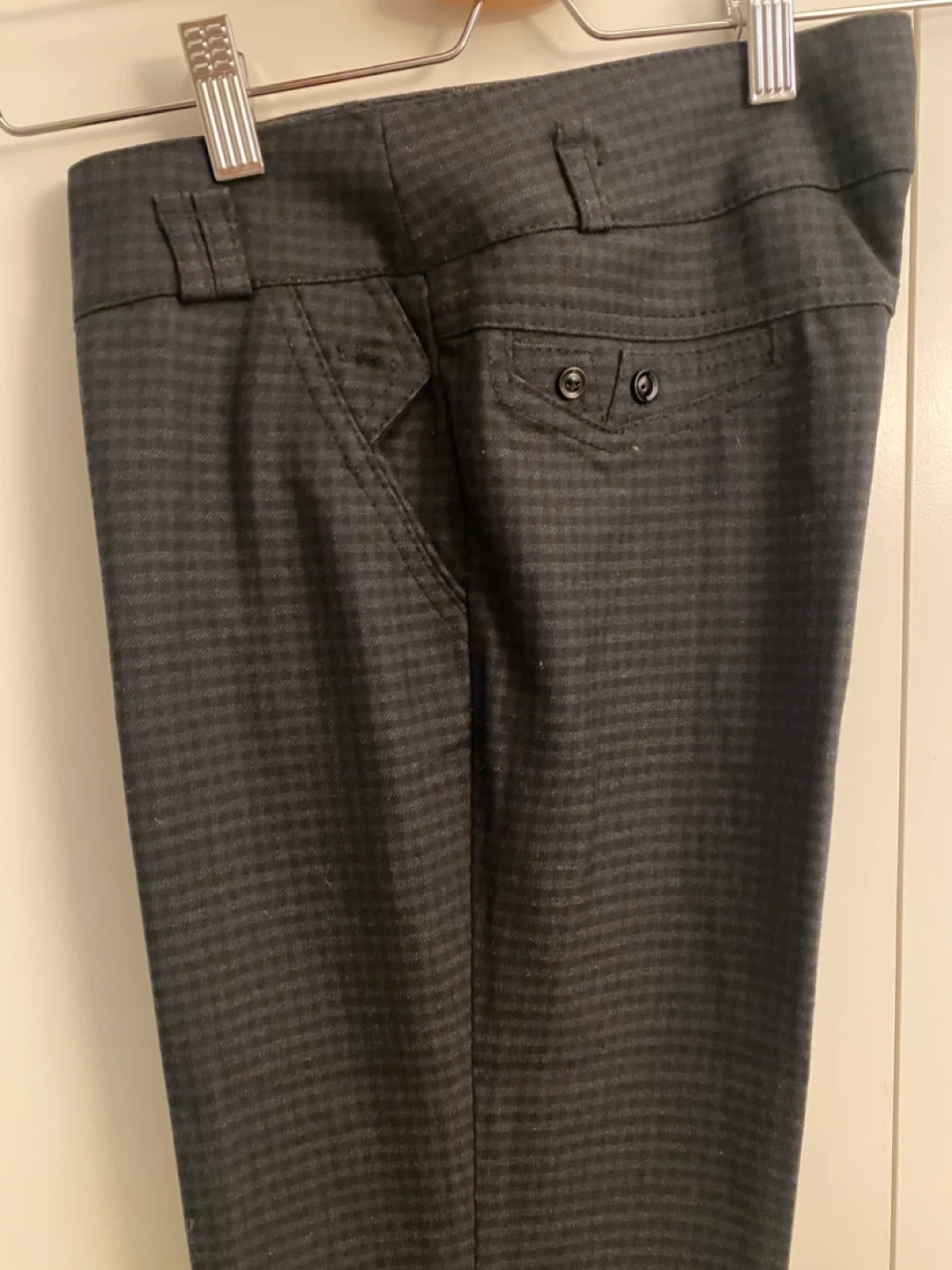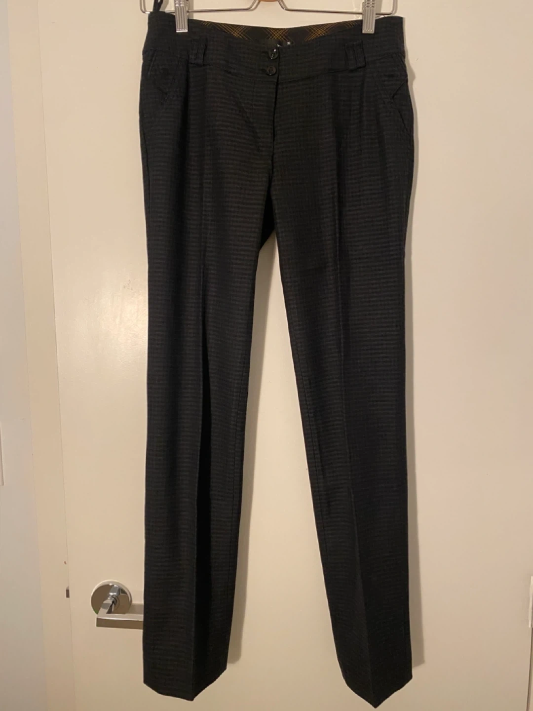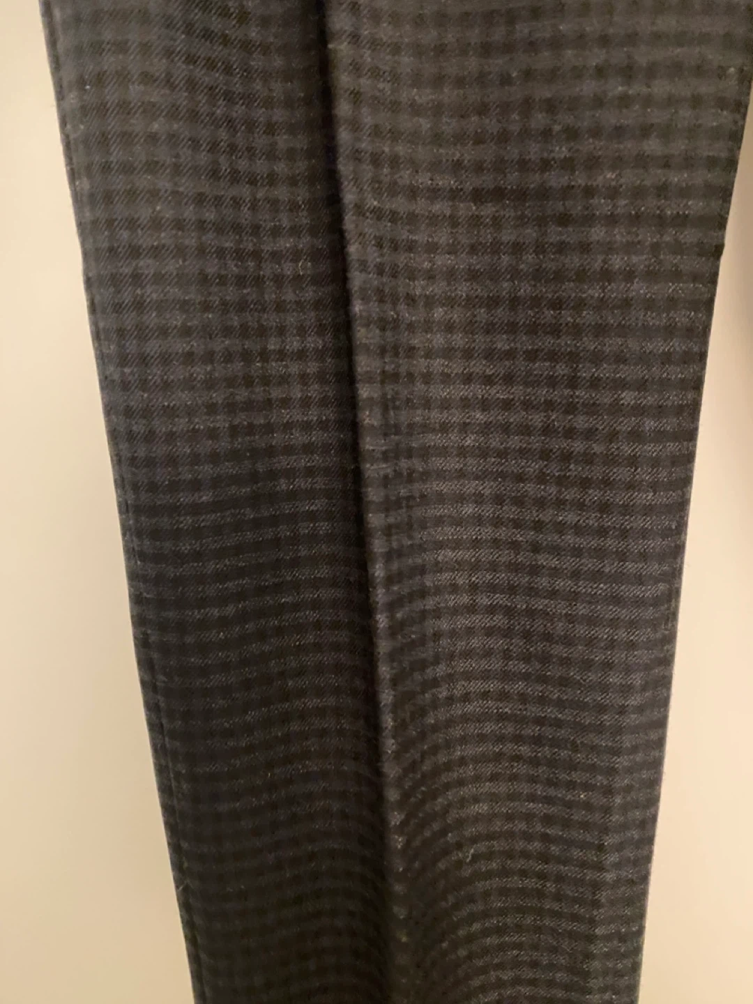 Classic grey dress pants with a subtle plaid pattern. These trousers offer a tailored fit and a smart look. Material is a blend, likely wool mostly and some synthetic.
