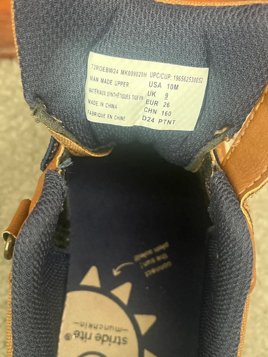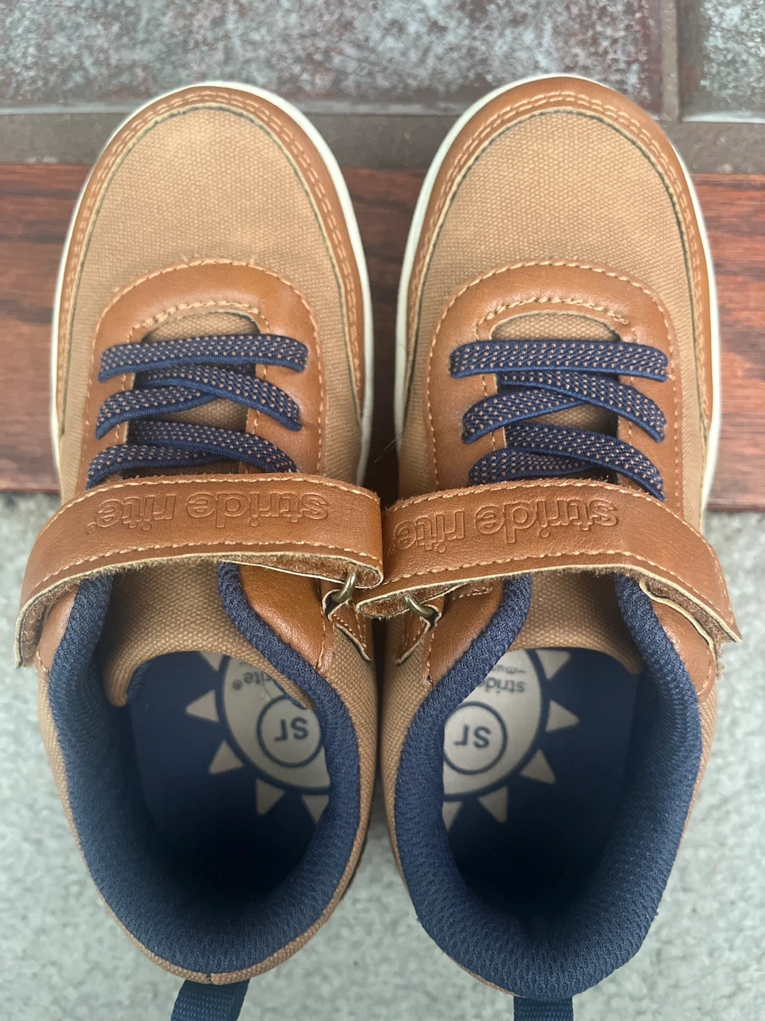 These Stride Rite shoes are made with a brown canvas and leather upper. They feature blue laces and a hook-and-loop strap for easy on and off. Size is 10 Toddler.