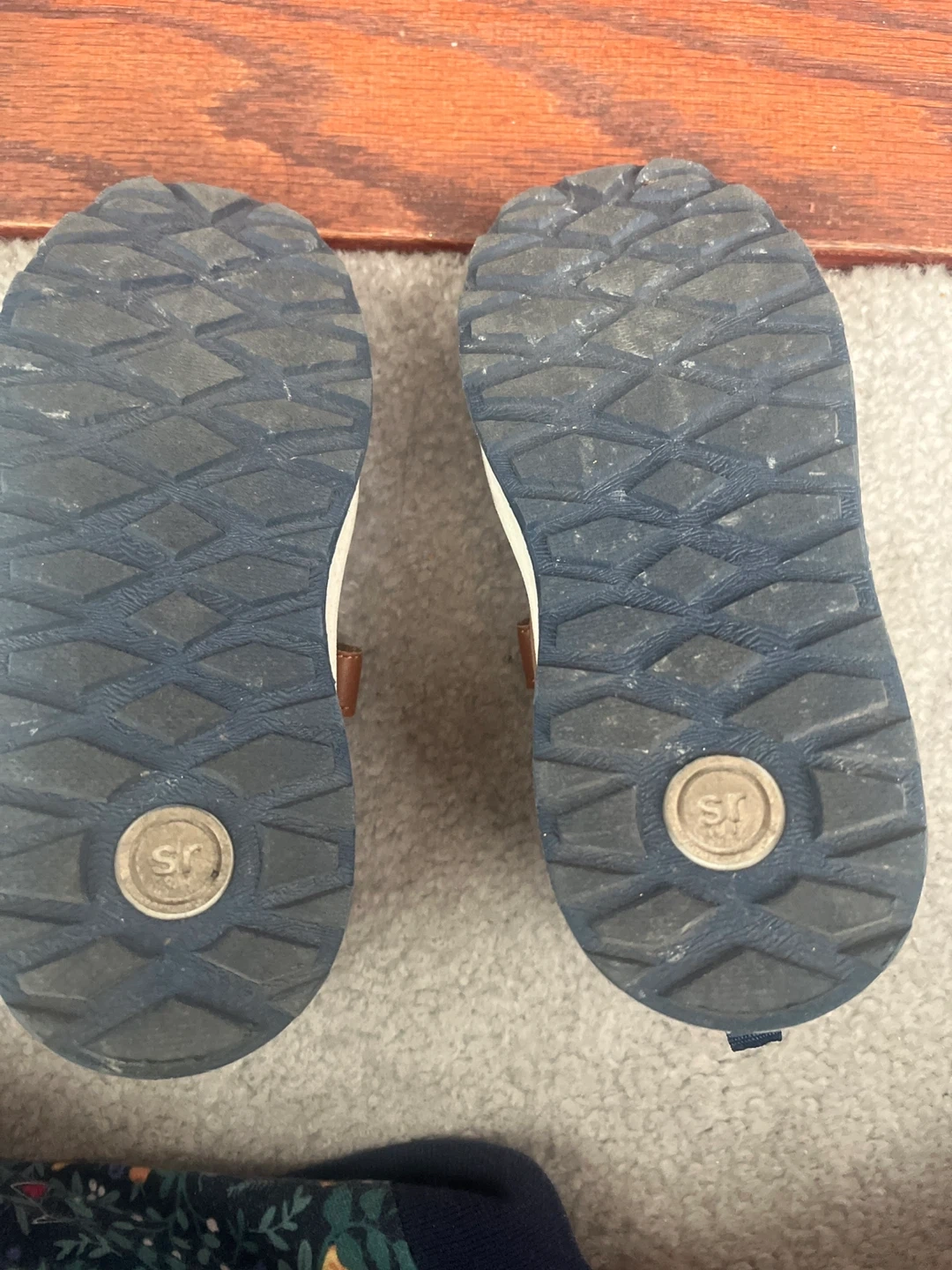 These Stride Rite shoes are made with a brown canvas and leather upper. They feature blue laces and a hook-and-loop strap for easy on and off. Size is 10 Toddler.