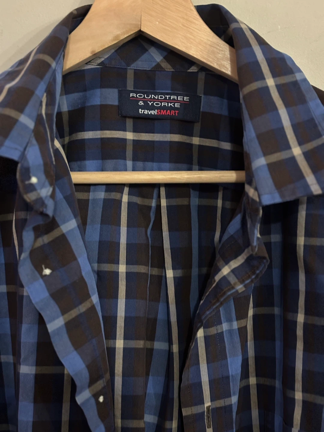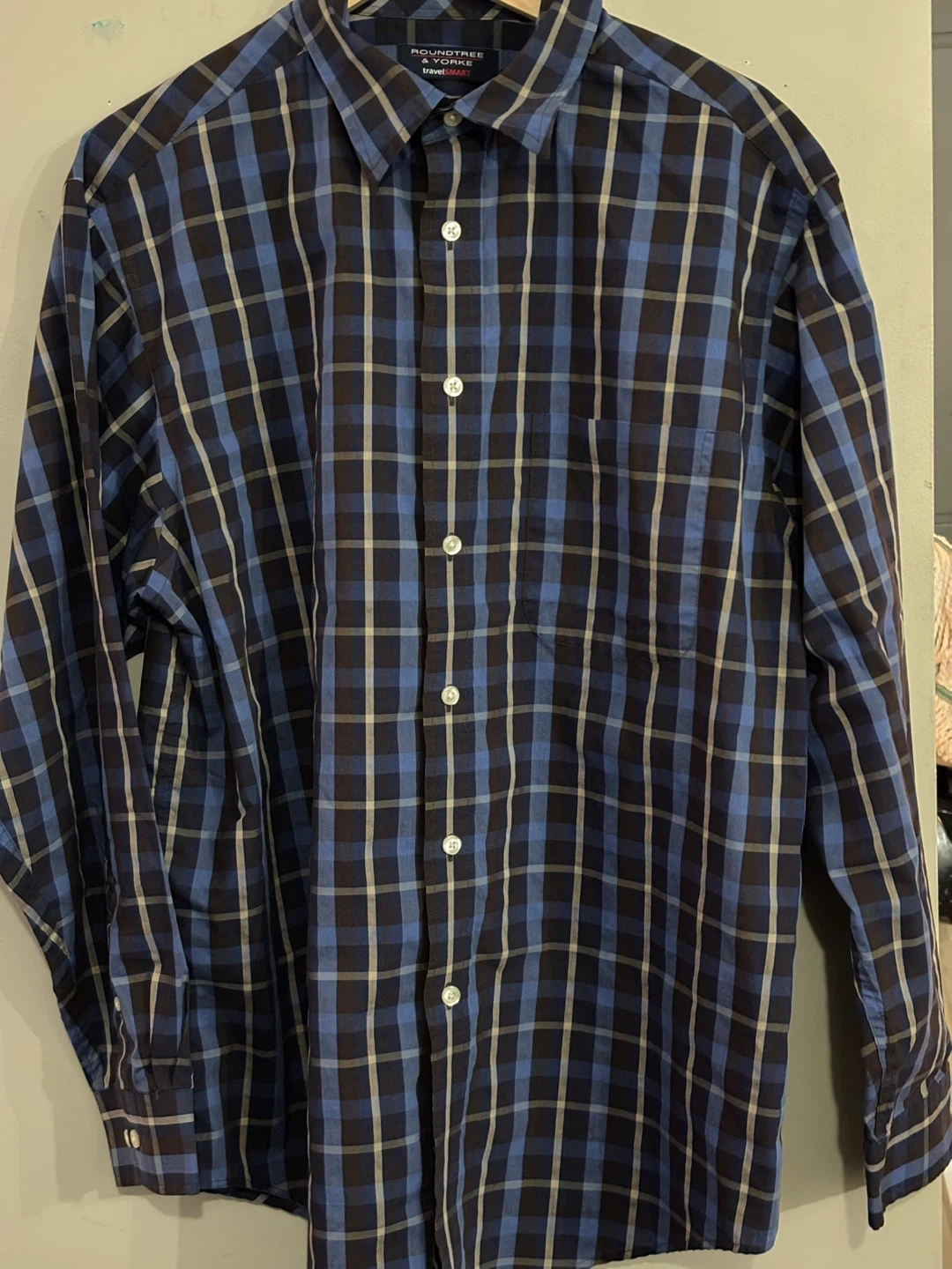 Here's a Roundtree & Yorke large travelSMART button-down shirt in a classic plaid pattern! It's perfect for a casual yet put-together look. The shirt features a comfortable fit and is made with quality materials.