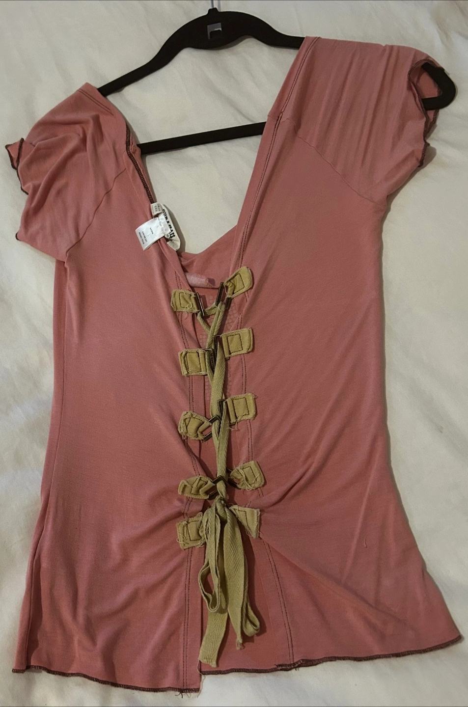 Dusty rose coloured short sleeve top. Features a lace-up back detail and rhinestone detailing on the front. Size S