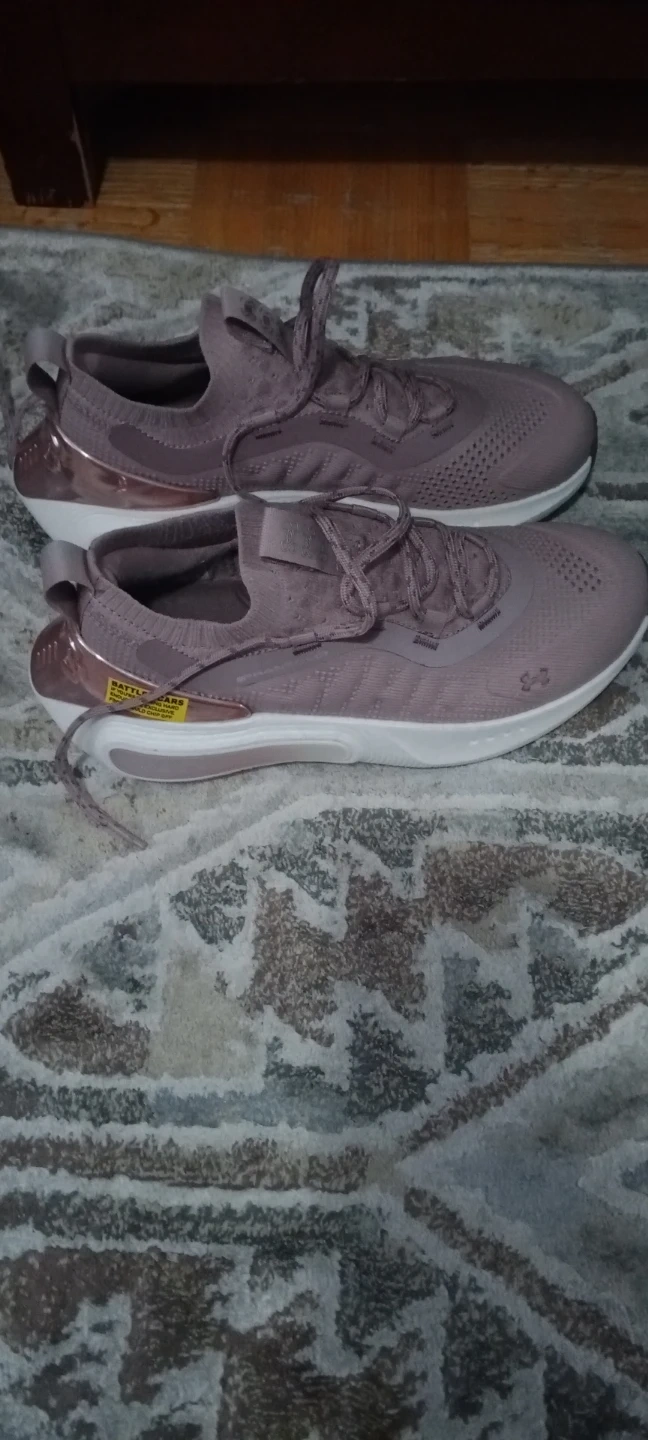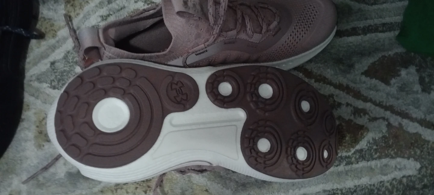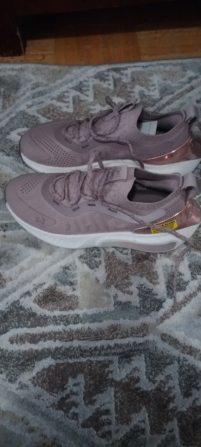 These Under Armour running shoes size 7 are a dusty rose colour. They feature a breathable mesh upper and a cushioned sole for comfort. Great for hitting the gym or going for a jog!