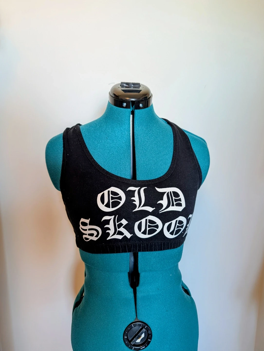 Black crop top with "Old Skool" graphic. Features a criss-cross strap back design. Made from a soft, comfortable fabric. Perfect for casual wear or workouts!