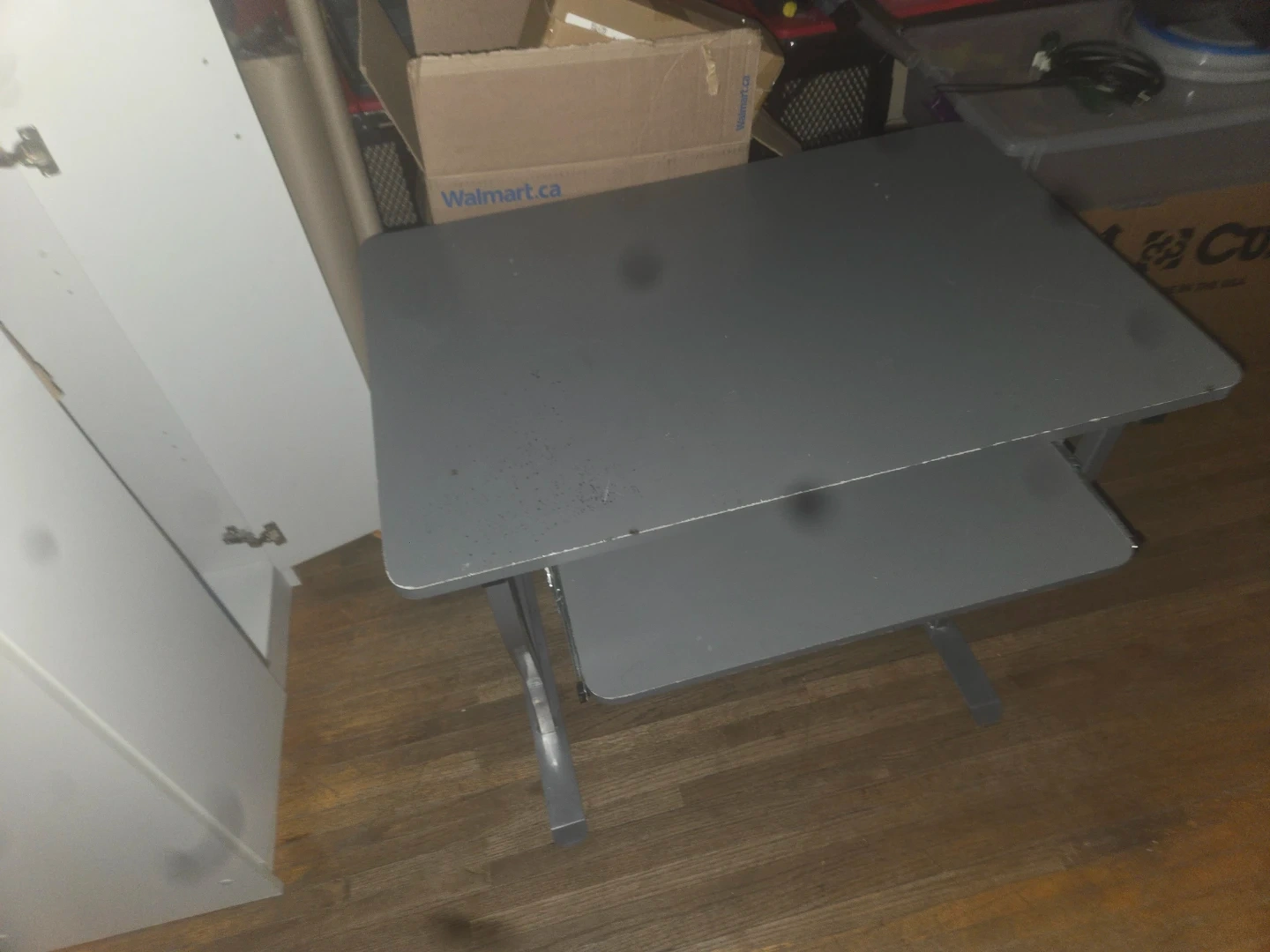 This is a grey metal desk stand with two tiers. It has a primary surface and a lower shelf for additional storage. Its simple design makes it versatile for home or office use.