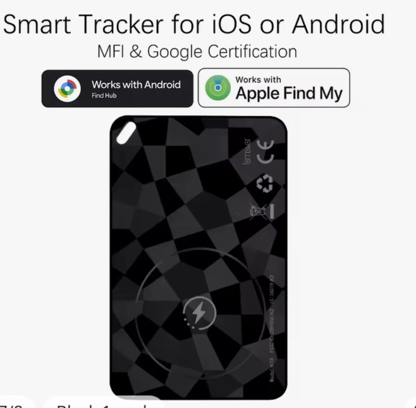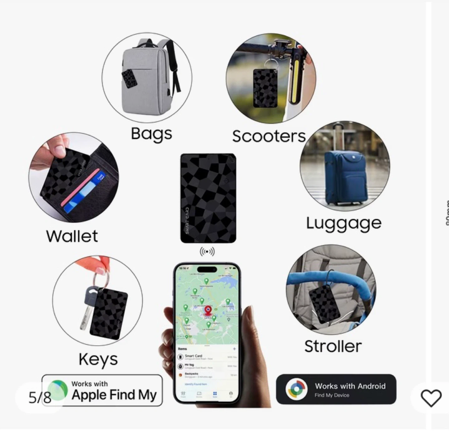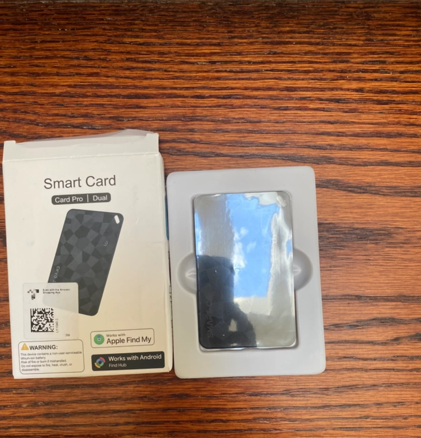This Smart Card is compatible with both Apple Find My and Android Find Hub. It's designed to fit easily into your wallet. A user manual and a strap are included.