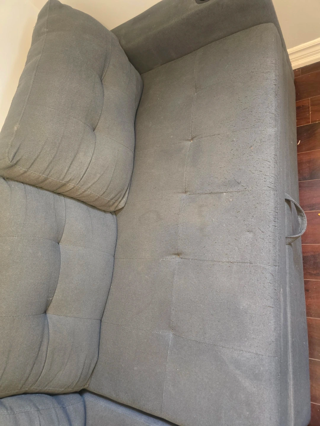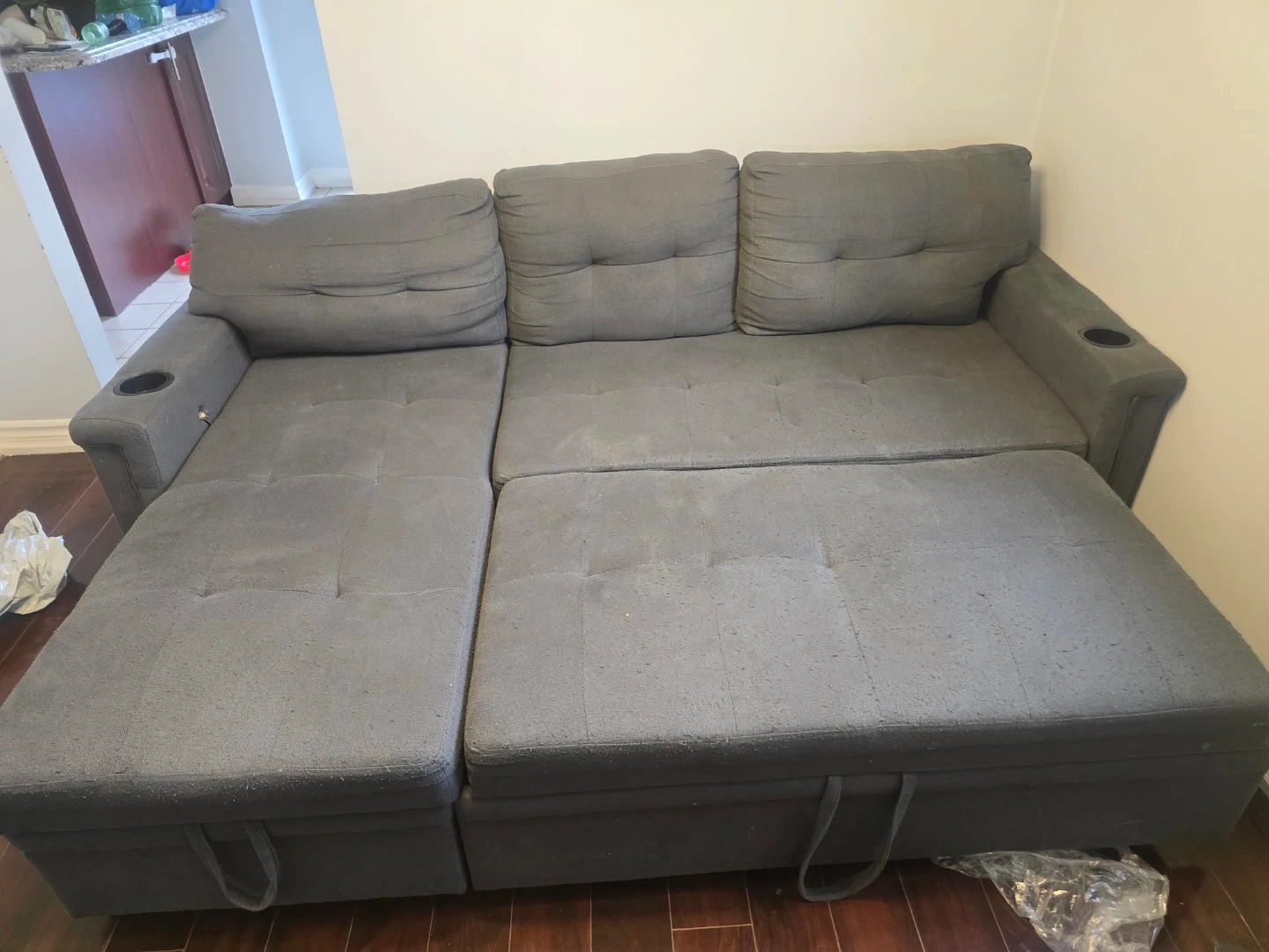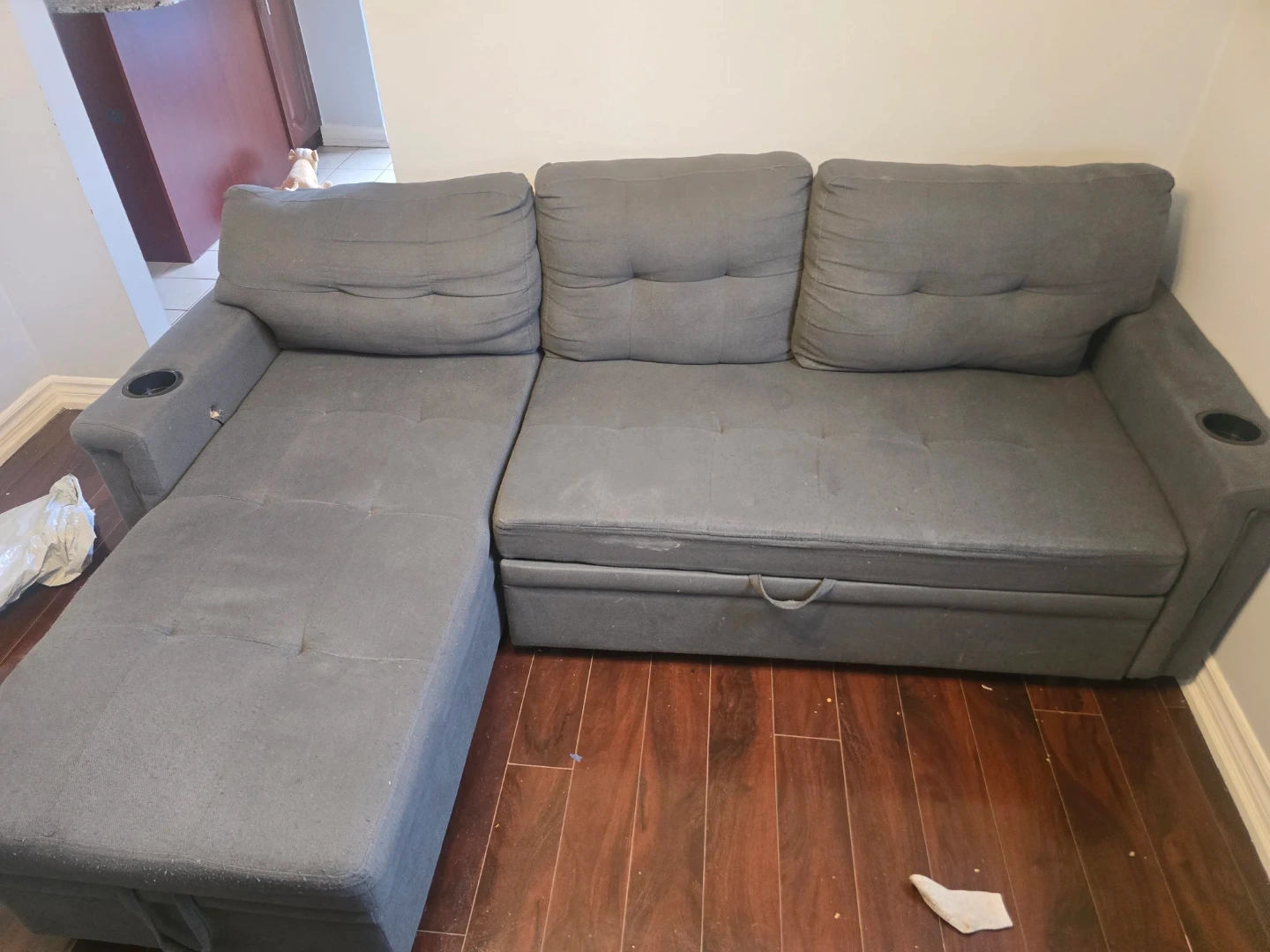 Moving Sale Grey fabric sectional sofa with a chaise lounge. It features tufted cushions and built-in storage. Cup holders are integrated into the arms. Perfect for small spaces needing extra seating and storage!