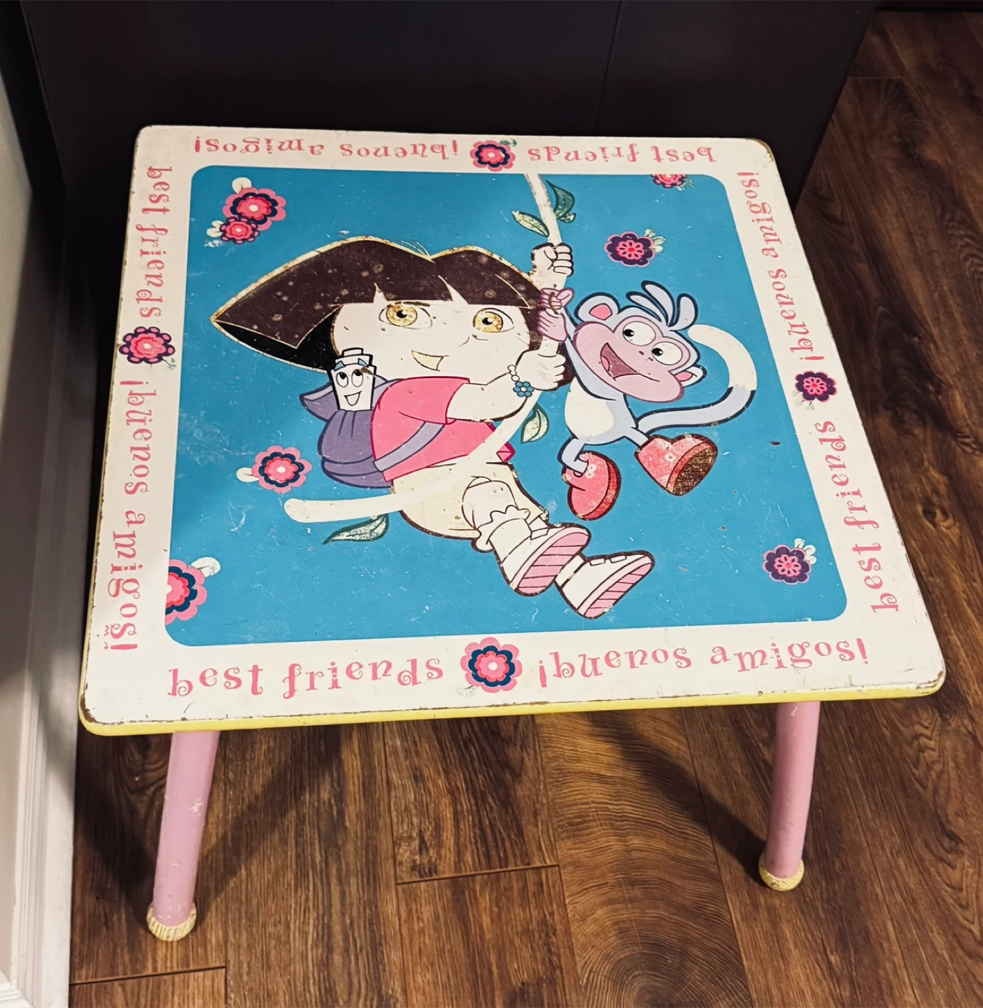 A Dora the Explorer kids table with colorful graphics. Features 'best friends' and '¡buenos amigos!' text. Legs are pink.