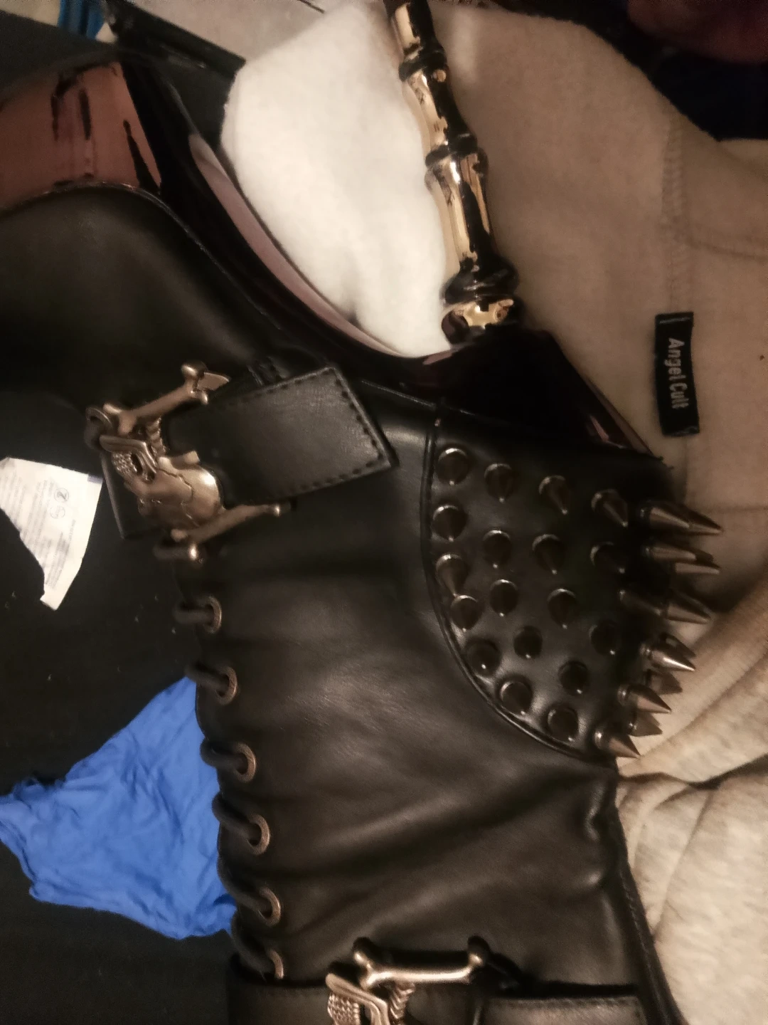 These statement boots are black with a platform sole and a tall heel. They feature lace-up fronts with buckle closures adorned with skull details. Spikes and metallic accents add to the edgy design. These are eye-catching boots for a bold look! Vegan leather never worn retailcm close to 400 size 8
