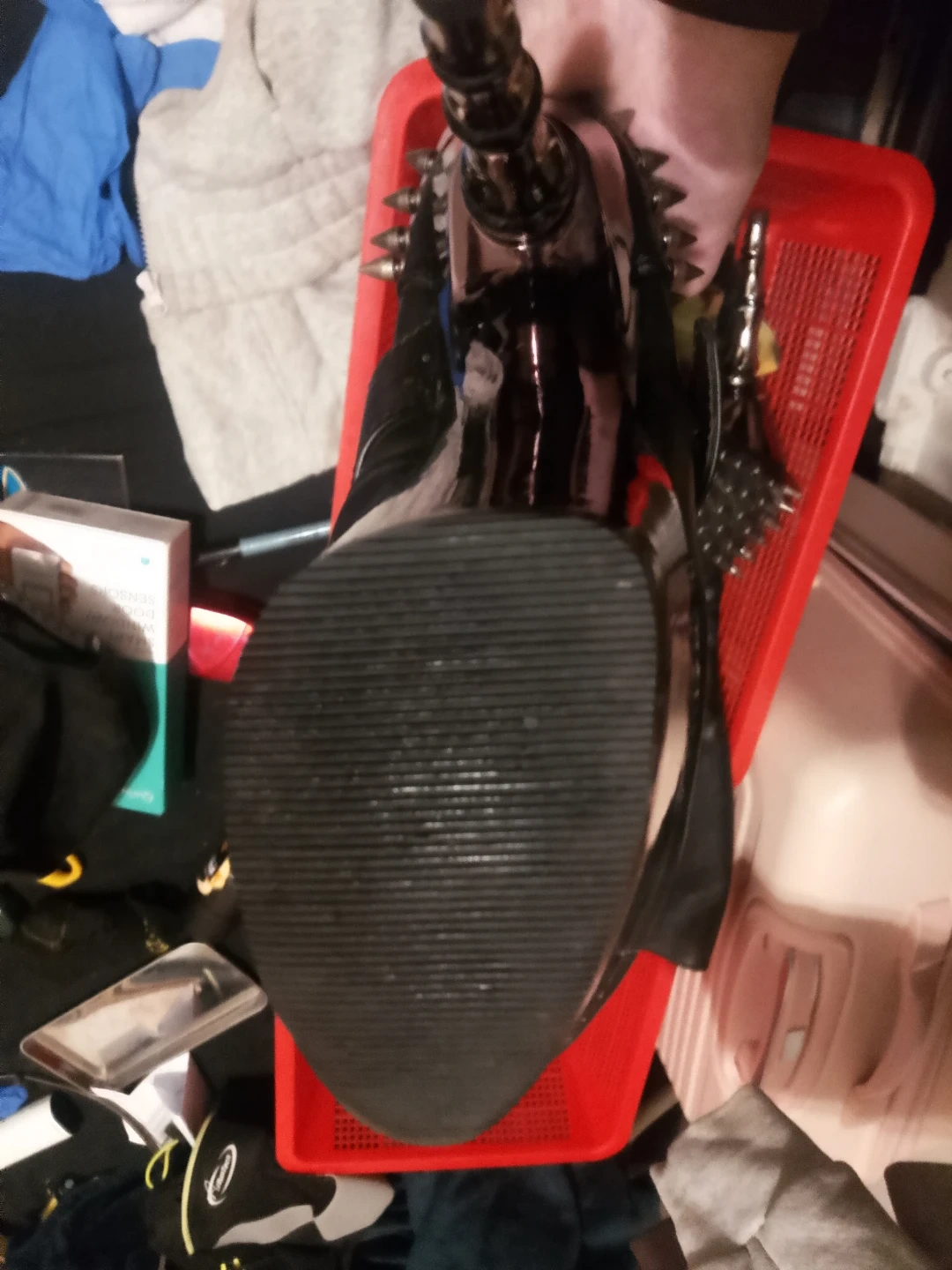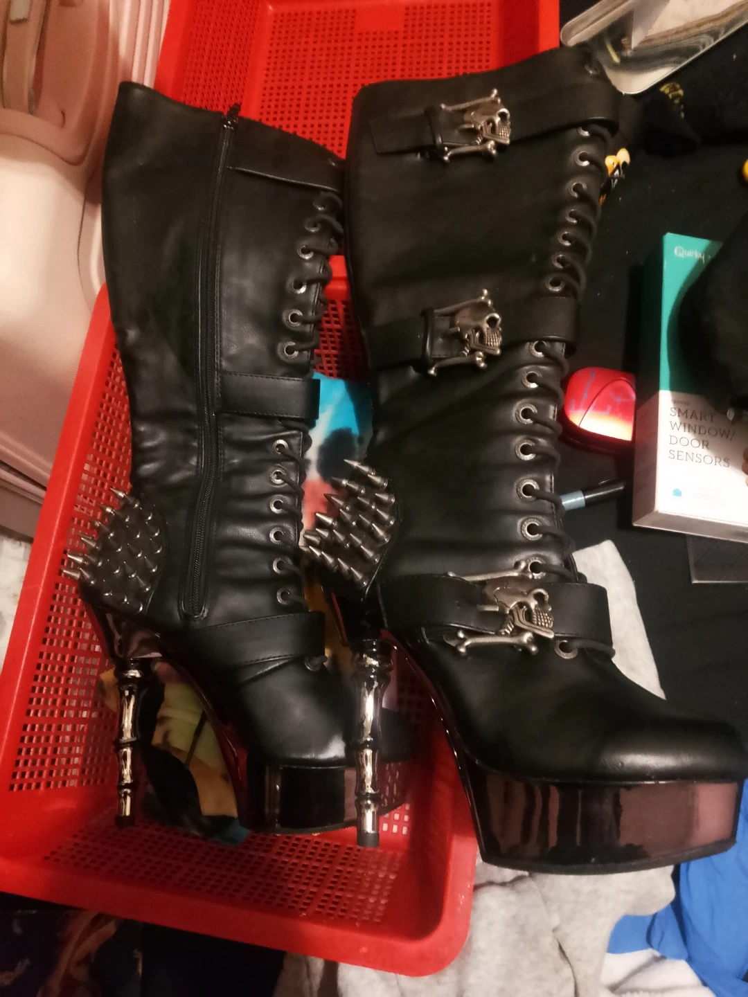 These statement boots are black with a platform sole and a tall heel. They feature lace-up fronts with buckle closures adorned with skull details. Spikes and metallic accents add to the edgy design. These are eye-catching boots for a bold look! Vegan leather never worn retailcm close to 400 size 8