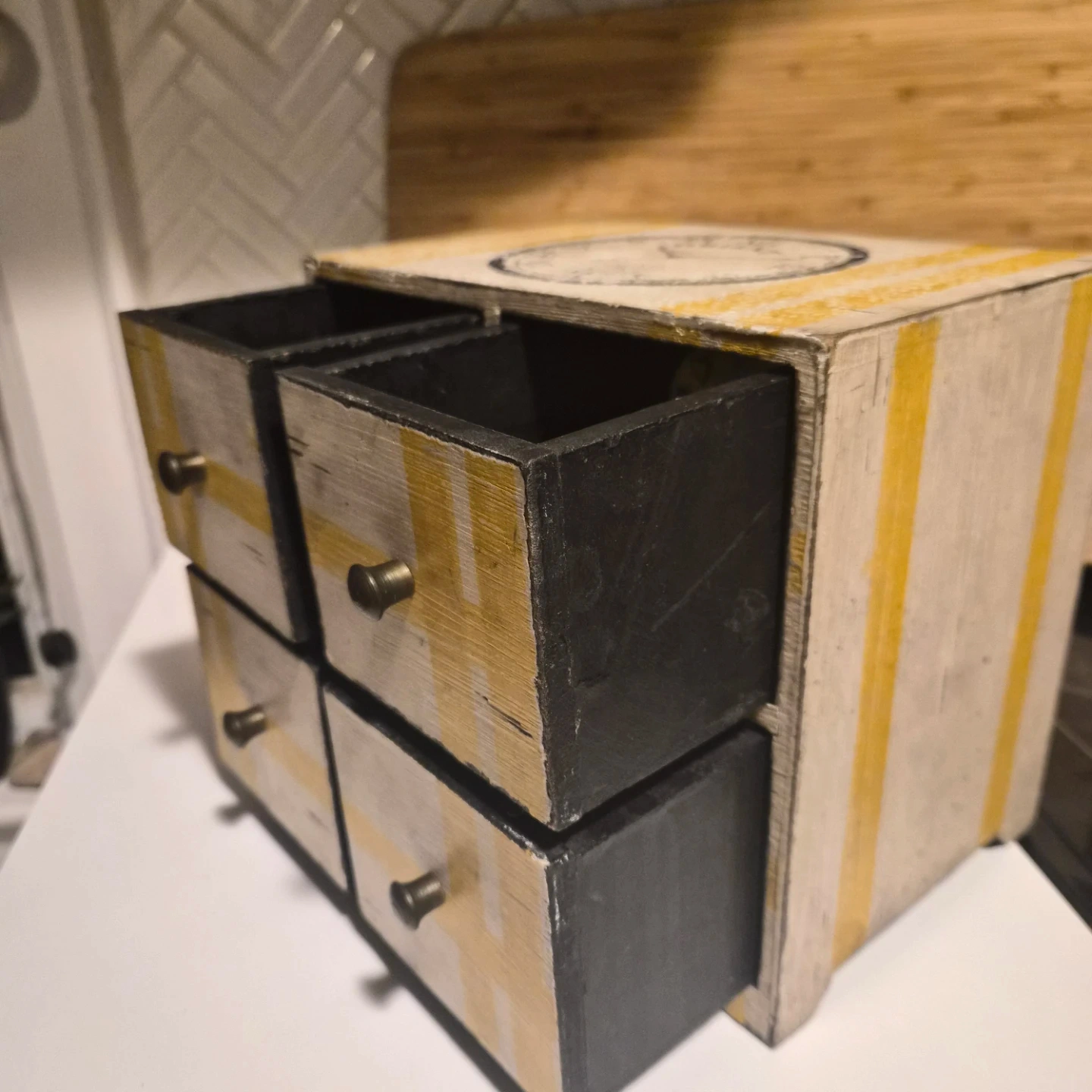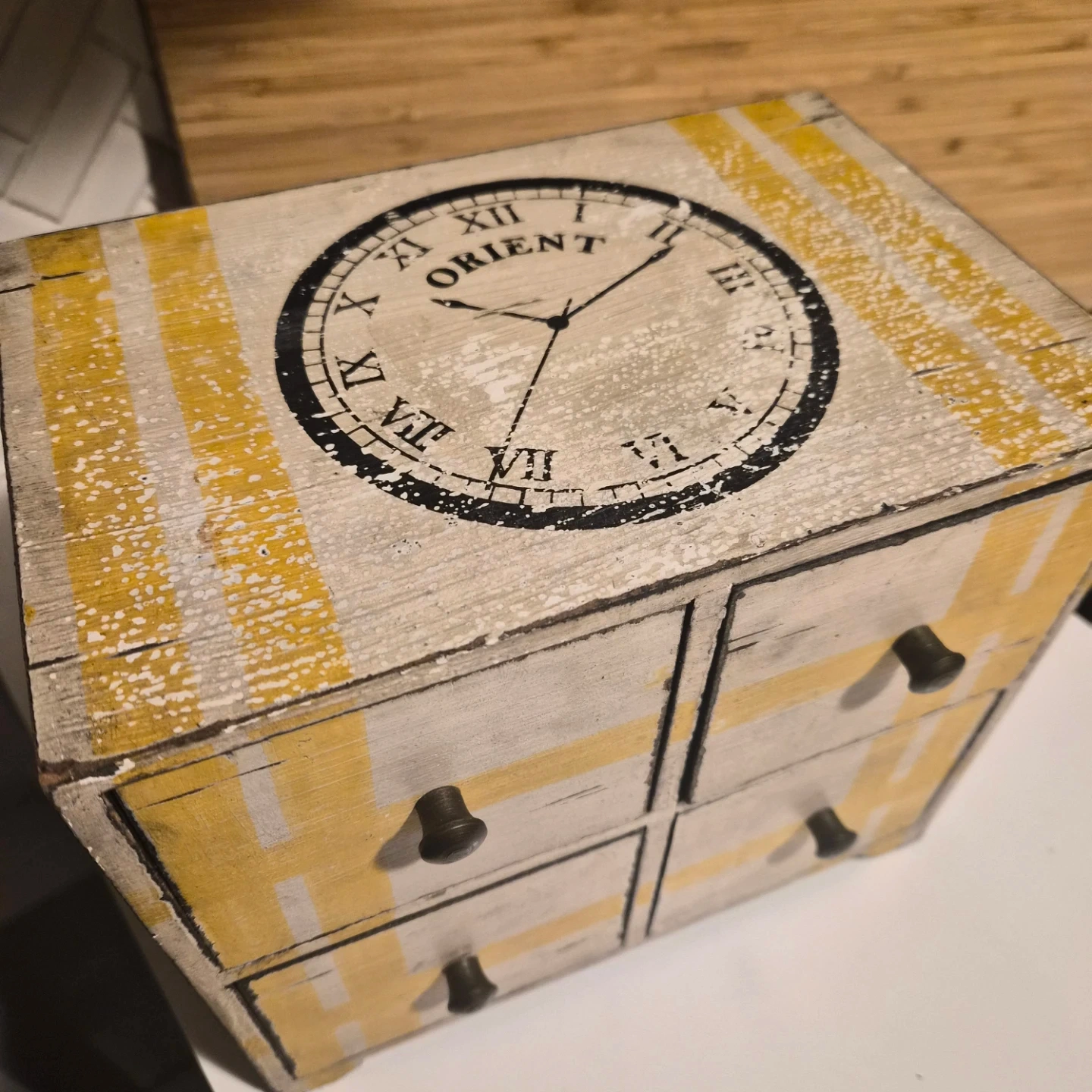 This eclectic tabletop organizer features a distressed white finish with yellow striped accents and a vintage clock face design. It has four small drawers, each with a burnished brass knob, perfect for storing small items. It's a great addition for keeping trinkets or desk supplies tidy!