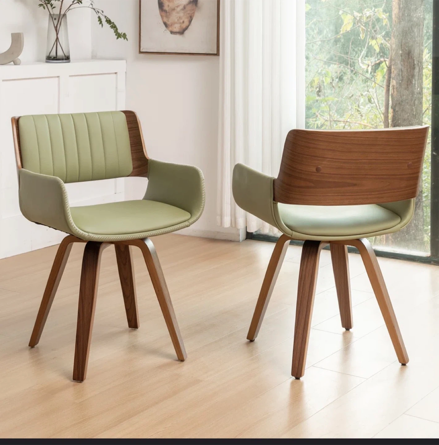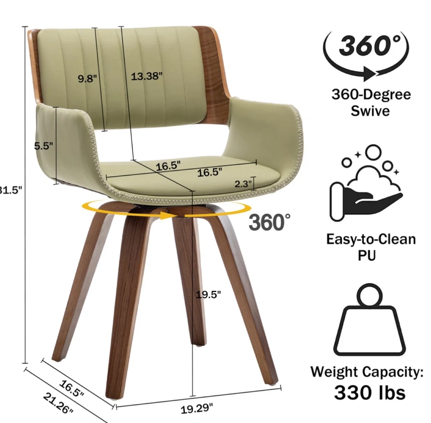 Looking to add some style to your dining space? Check out this swivel dining chair! It features a comfortable, easy-to-clean PU seat and a sturdy wood base. The 360-degree swivel function adds extra convenience. It can hold up to 330 lbs. Dimensions are approximately 31.5" high, 21.26" wide, and 19.29" deep