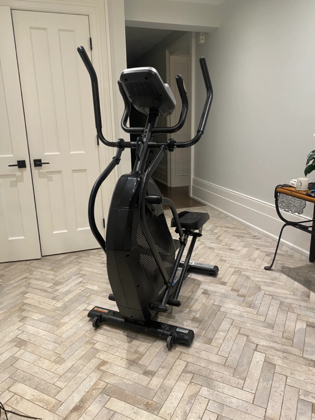 Modern black elliptical trainer in great condition, perfect for home workouts. Features a built-in digital display to track your time, speed, distance, and calories burned. Equipped with sturdy foot pedals and dual-action handlebars for a full-body workout.