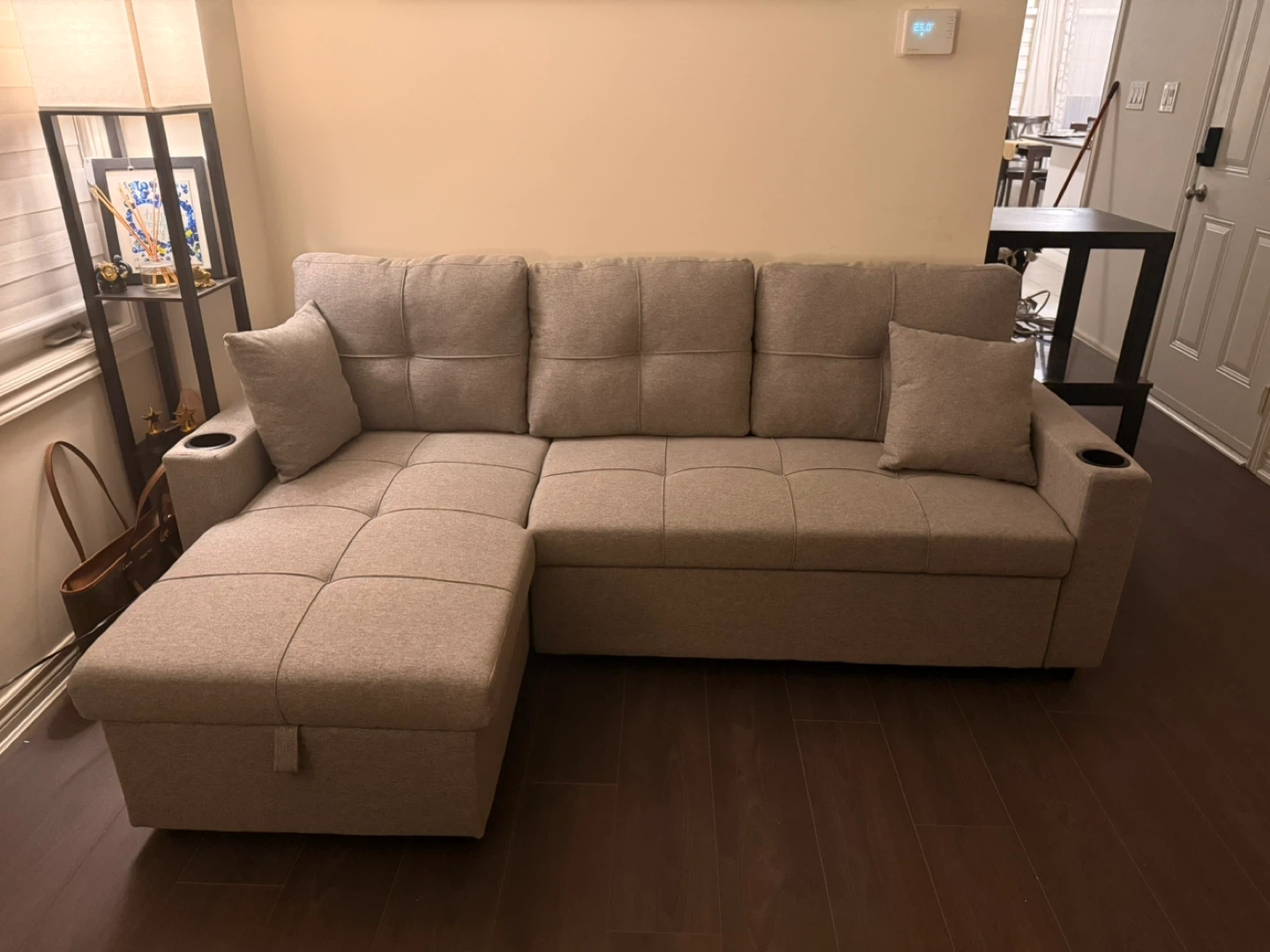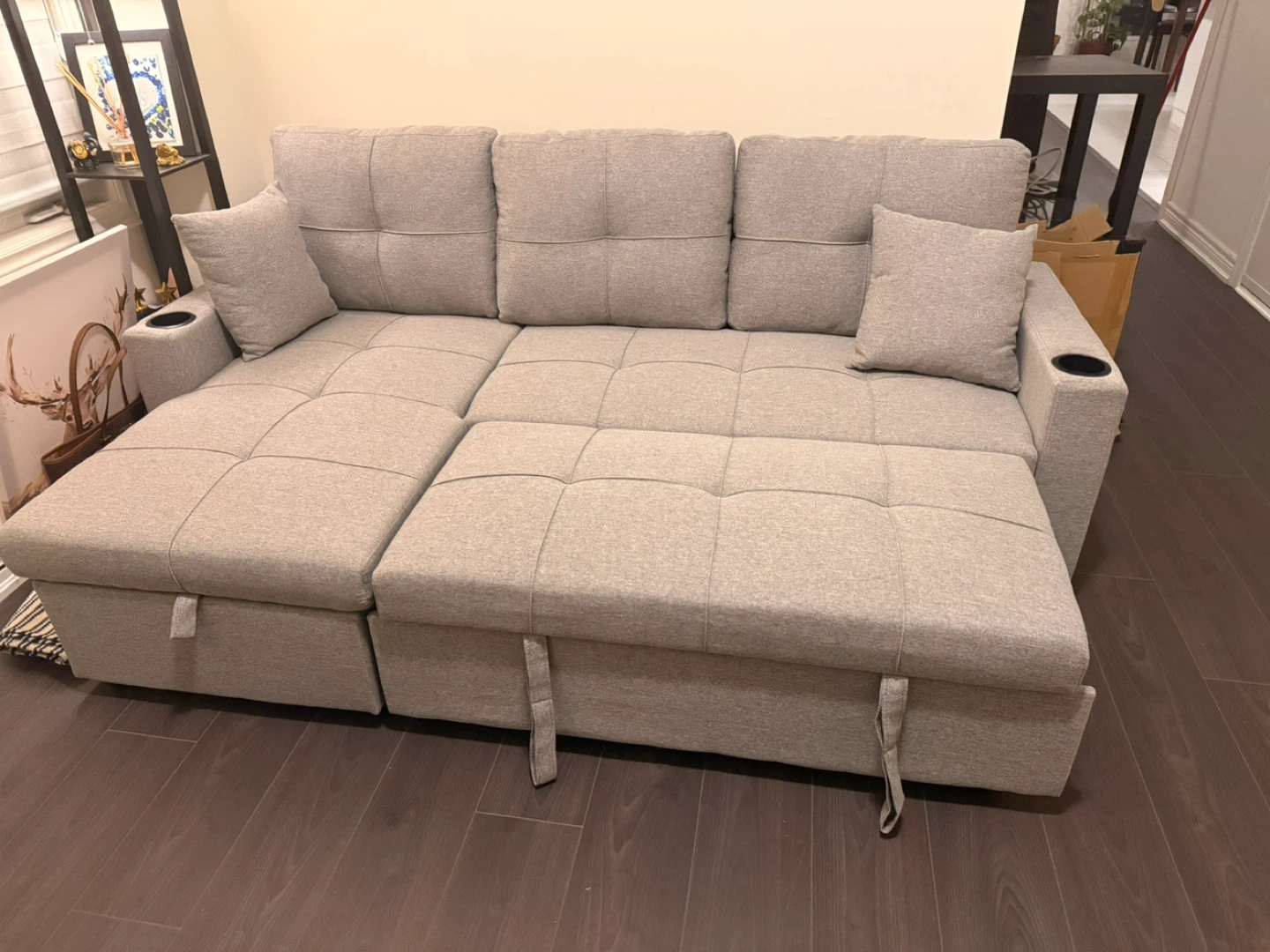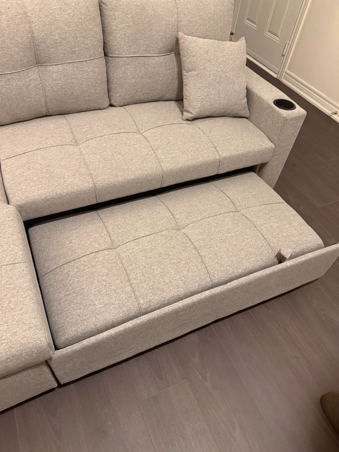 This grey sectional sofa features ample under-seat storage for blankets or pillows. It also has a pull-out bed for extra sleeping space. The fabric is a durable textured weave. Free delivery in GTA.